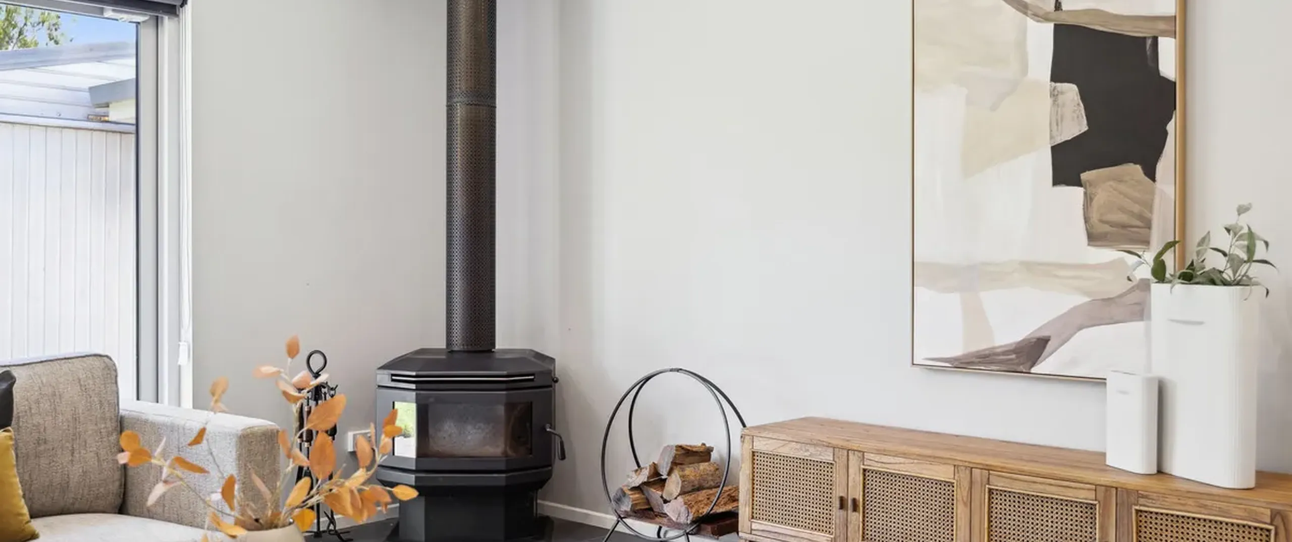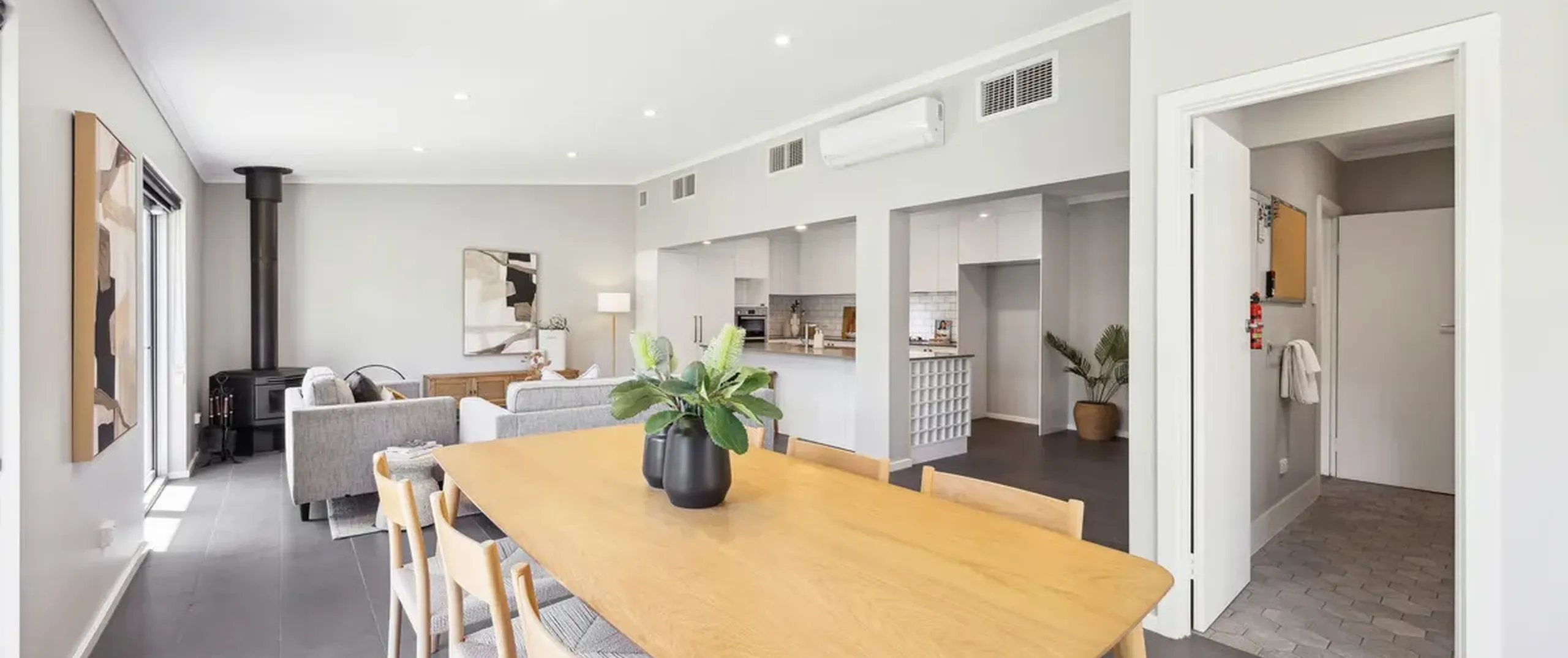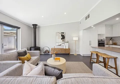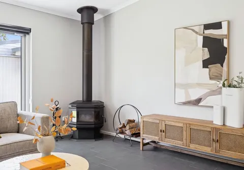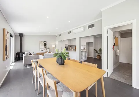 - Stunning open plan living, dining and kitchen area complete with a split system air conditioner and a wood fire and heat pump