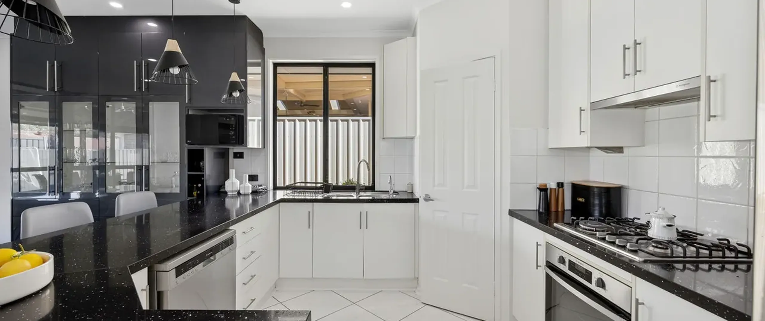 - Classic white kitchen with gas cooktop, Westinghouse dishwasher, instant hot water tap + filtered water and breakfast bar with overhead pendant lighting