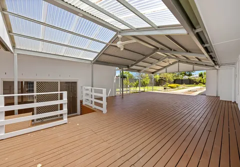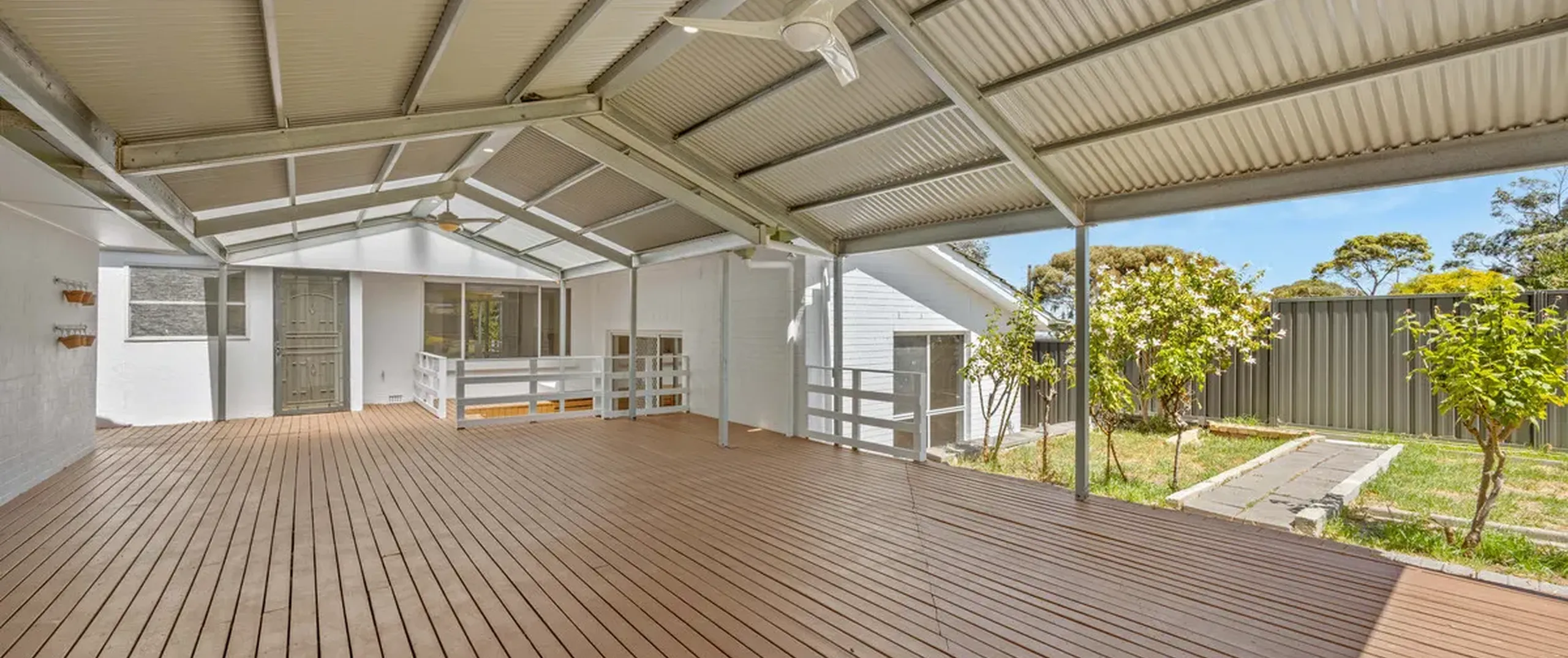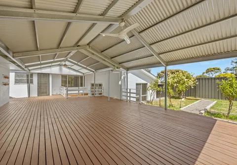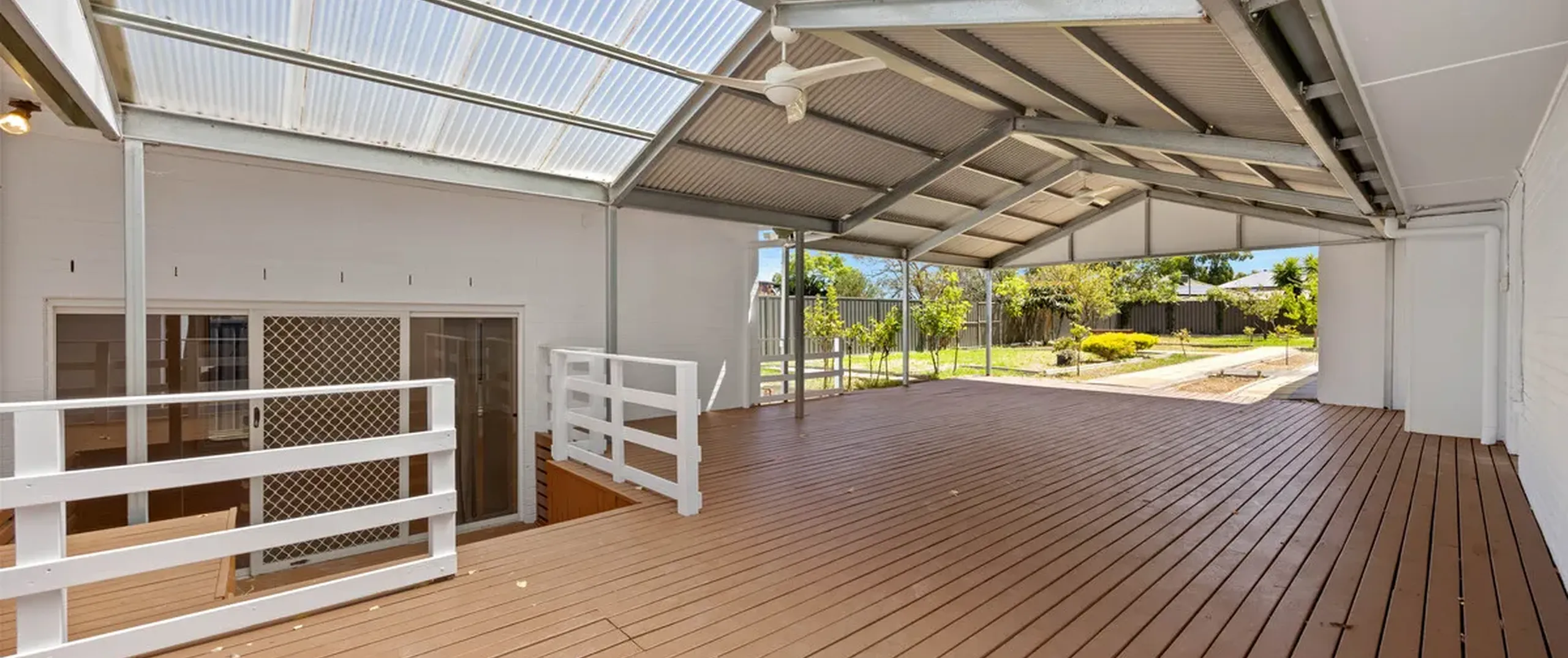 - Expansive decked outdoor entertaining area with pitched roof and ceiling fans