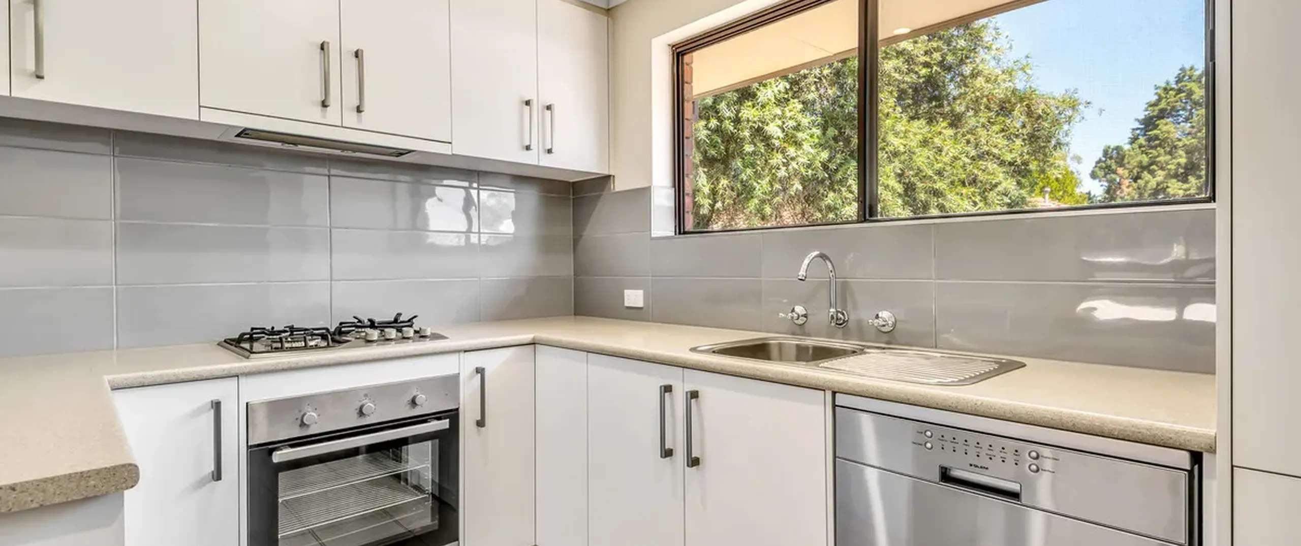 - Modern kitchen with stainless steel appliances, gas cooktop and dishwasher