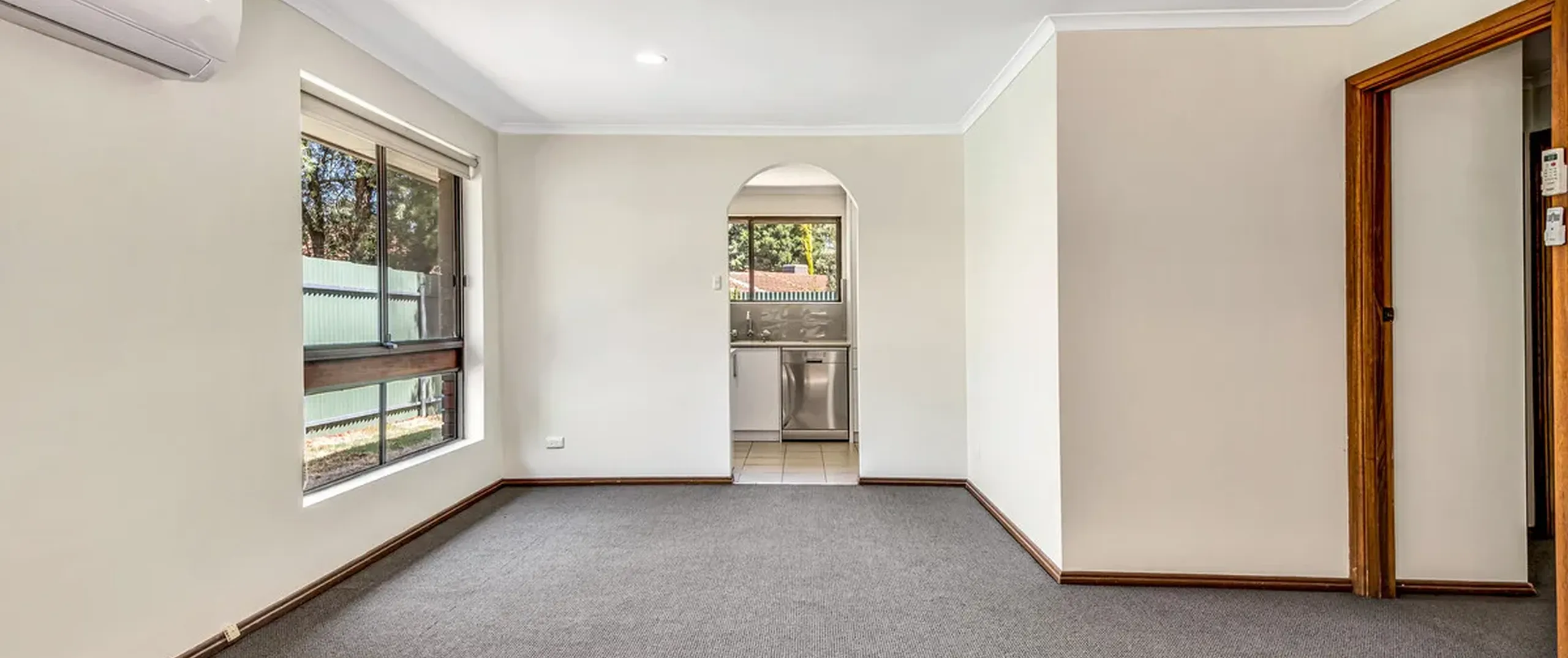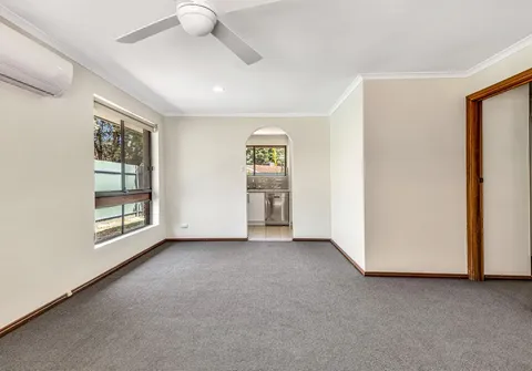 - Open plan living/dining area with split-system air-conditioner and ceiling fan