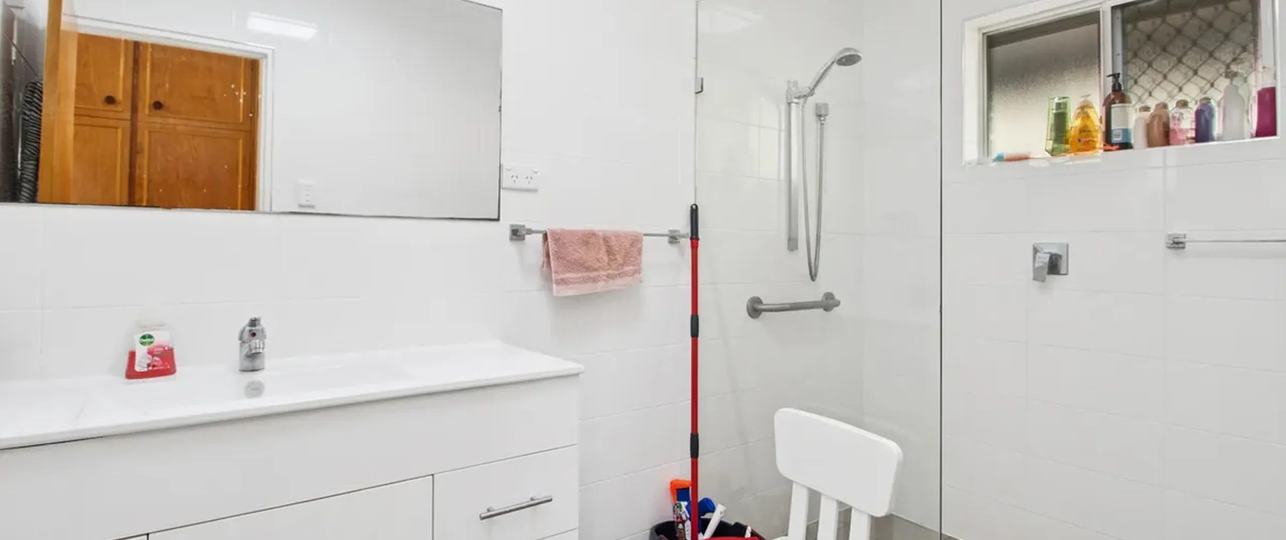 - Stylishly renovated bathroom with floor to ceiling tiles, oversized shower, modern vanity and separate toilet for added convenience