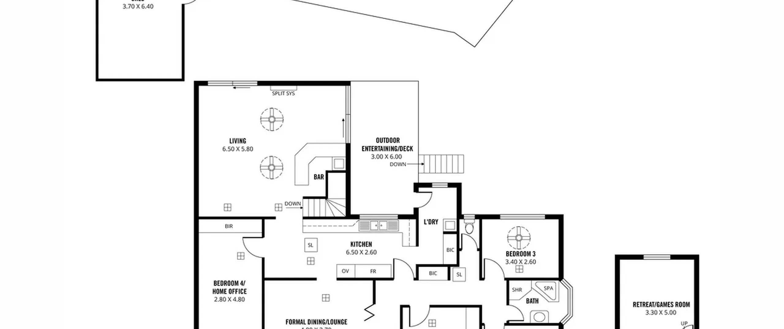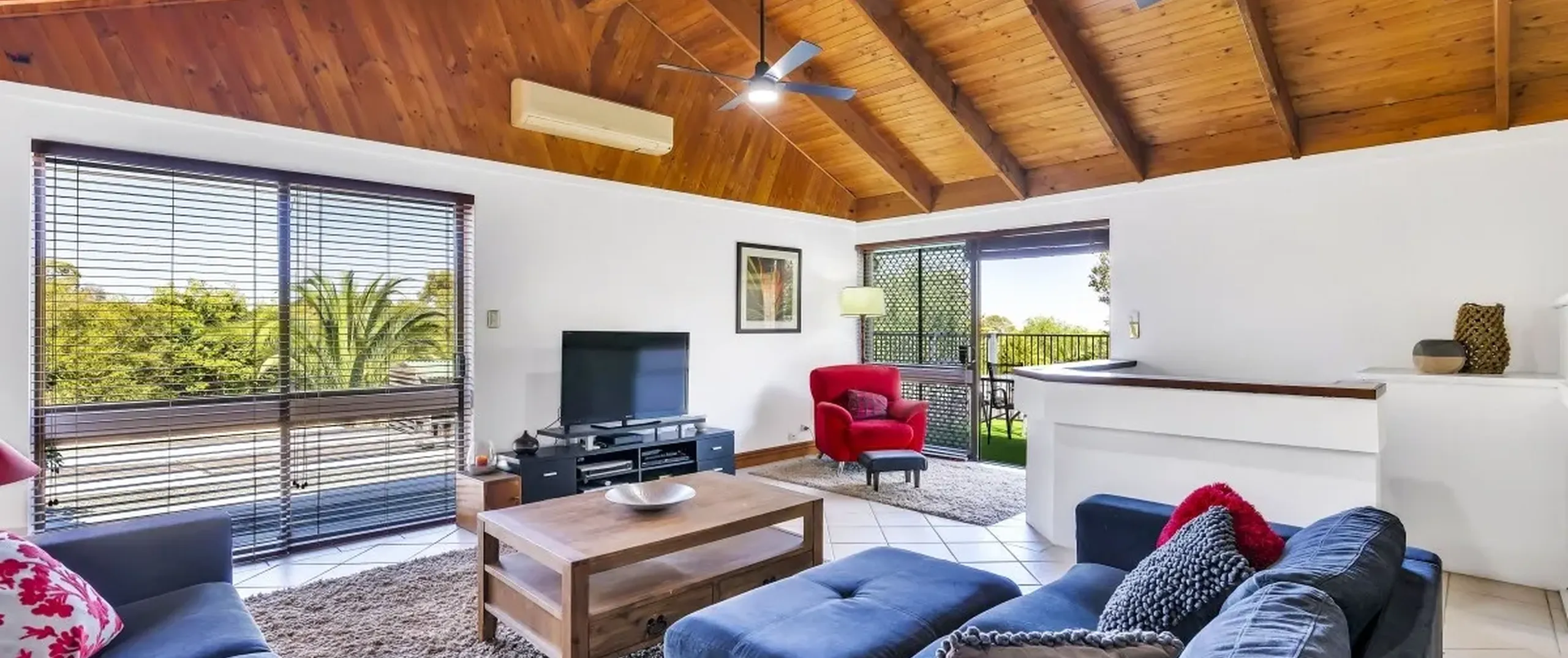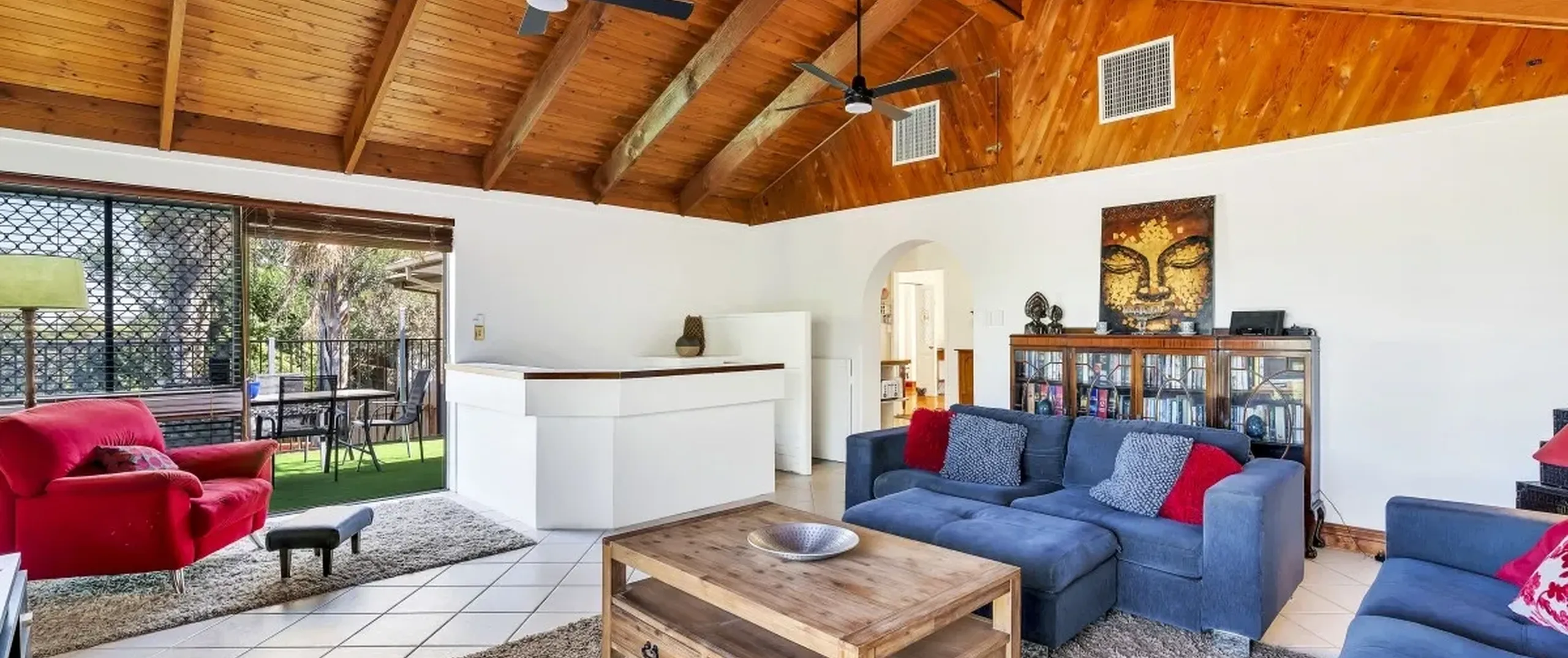 - A huge family room with timber cathedral ceiling, and boasting a wet bar complete with split system air conditioning and ceiling fans