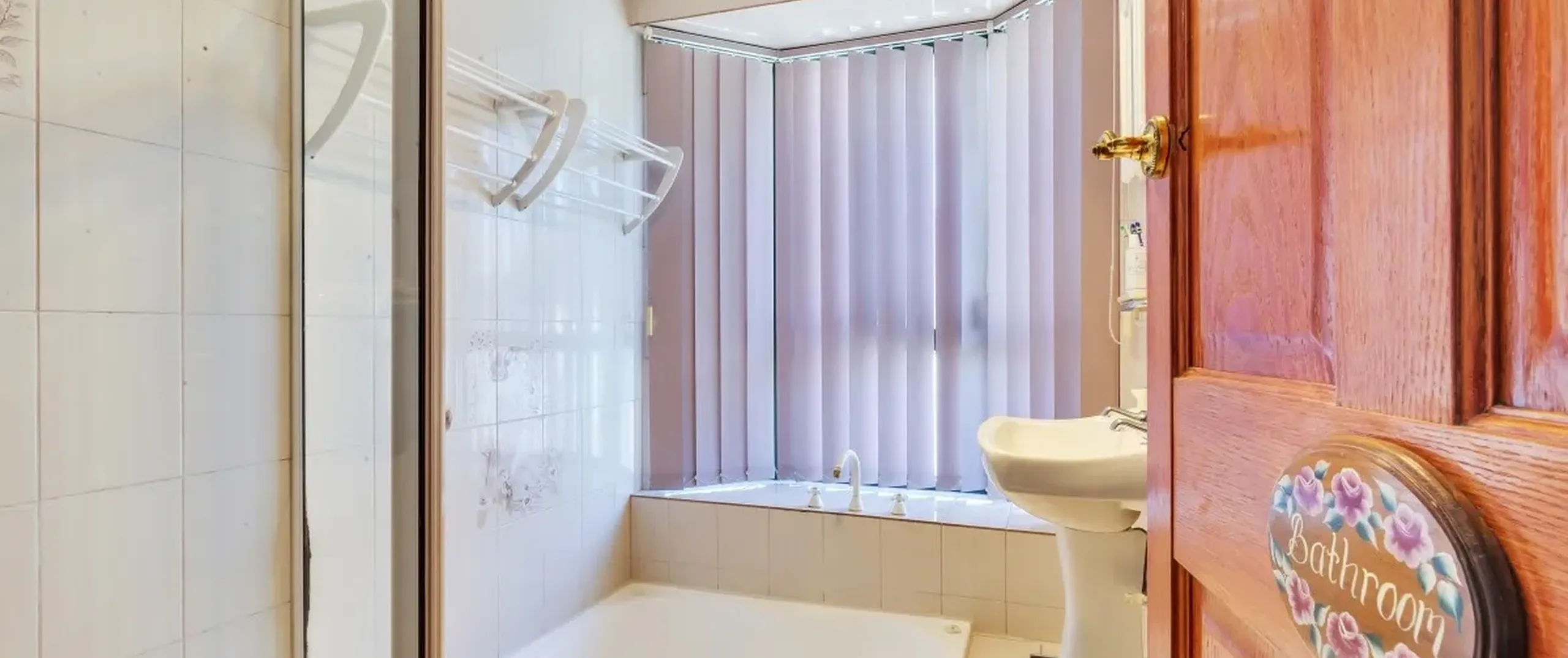 - Main bathroom with separate shower, separate sunken spa bath, heat lamp and separate toilet