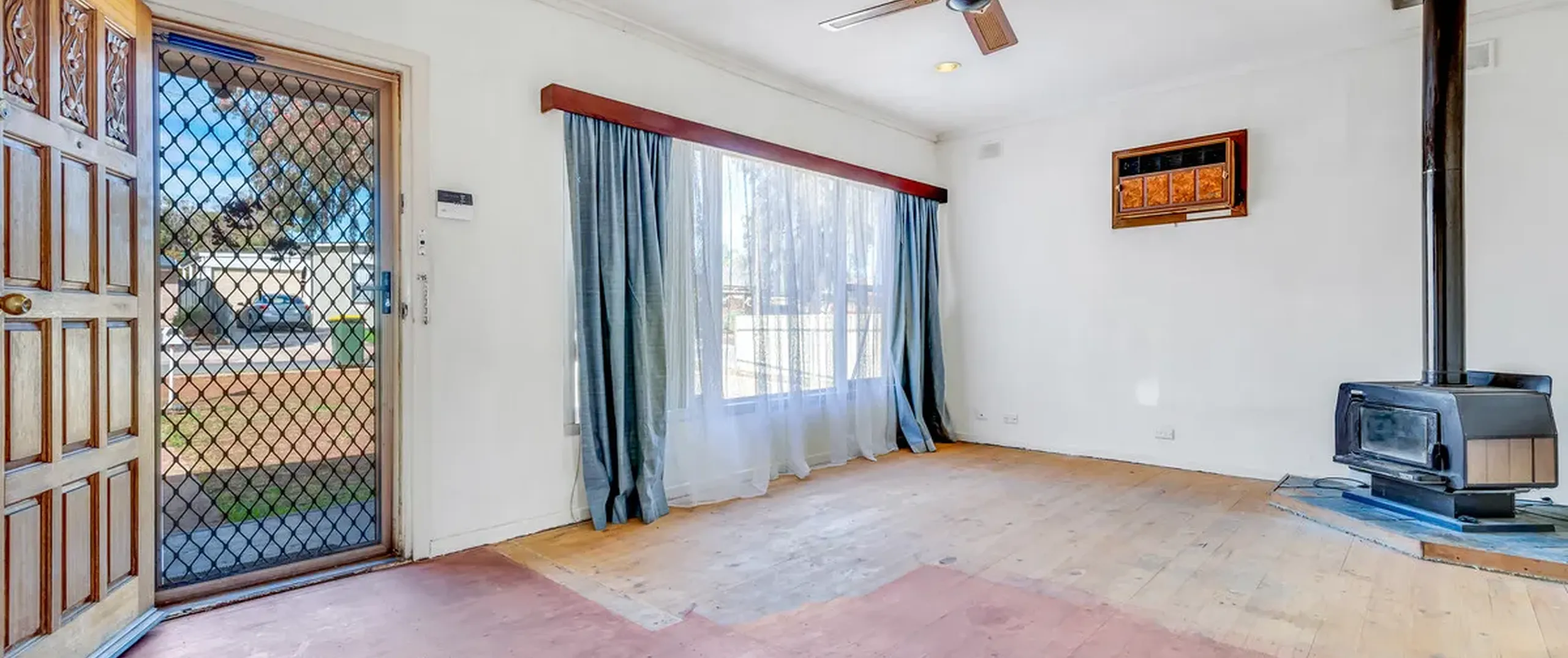 - Large, light filled living room with ceiling fan, air conditioner and combustion heater