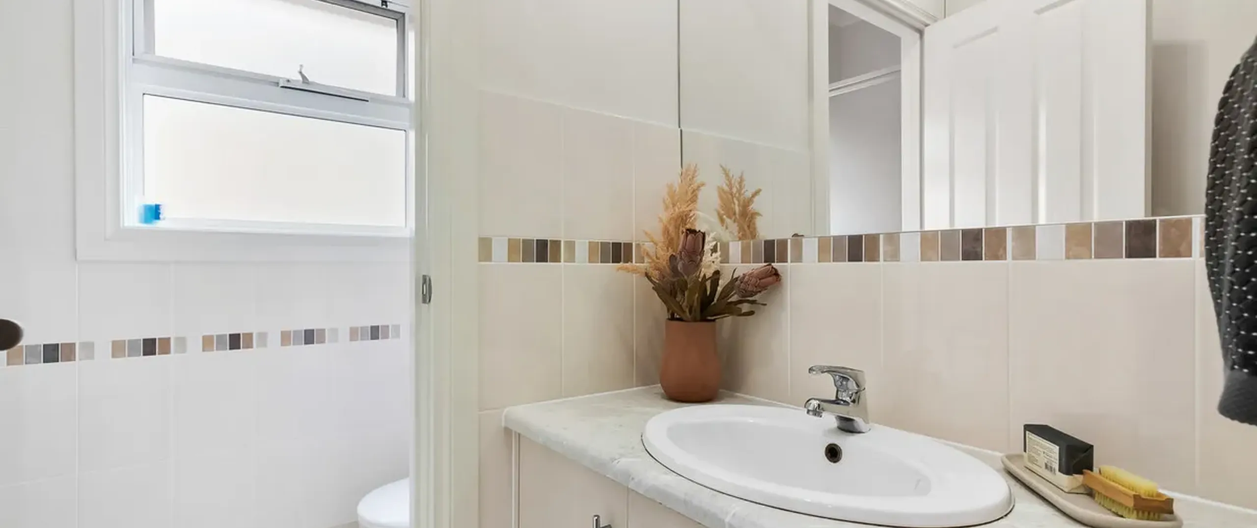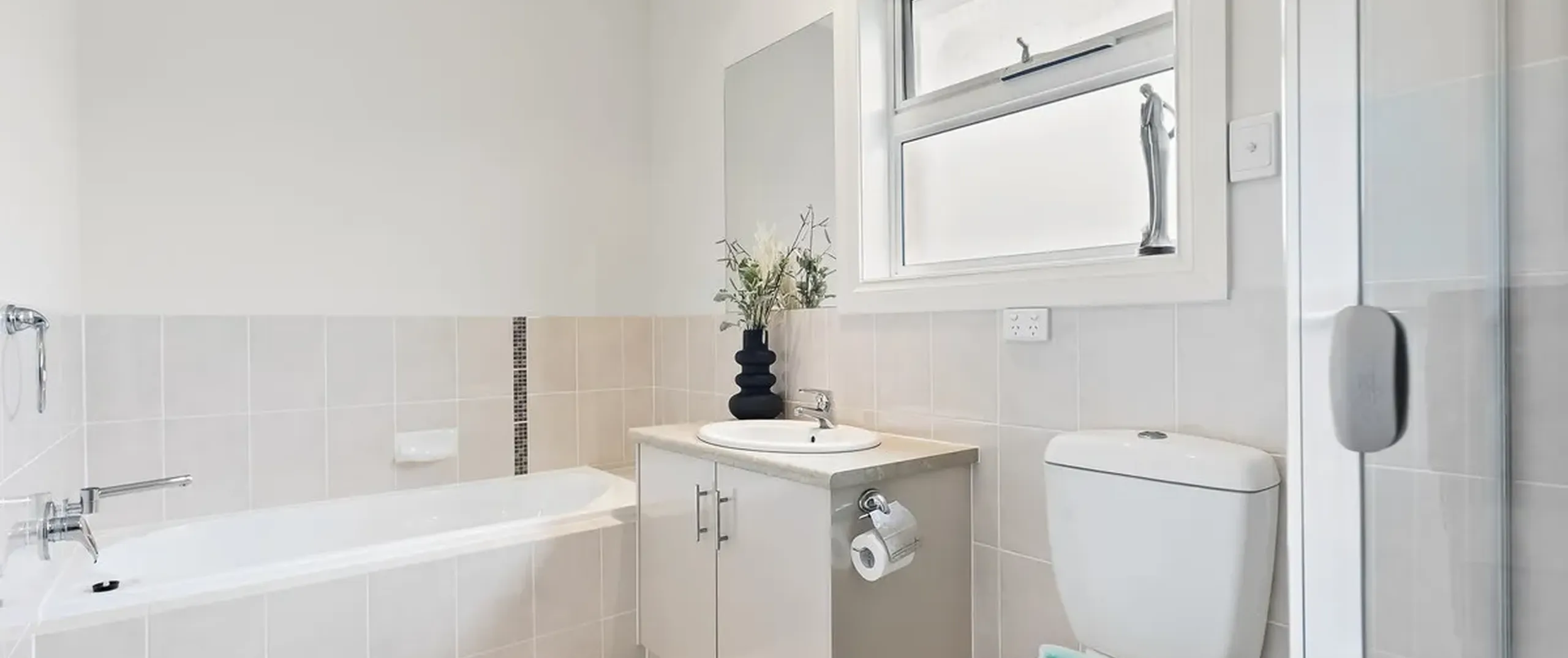 - Neutral main bathroom with separate bath and shower
