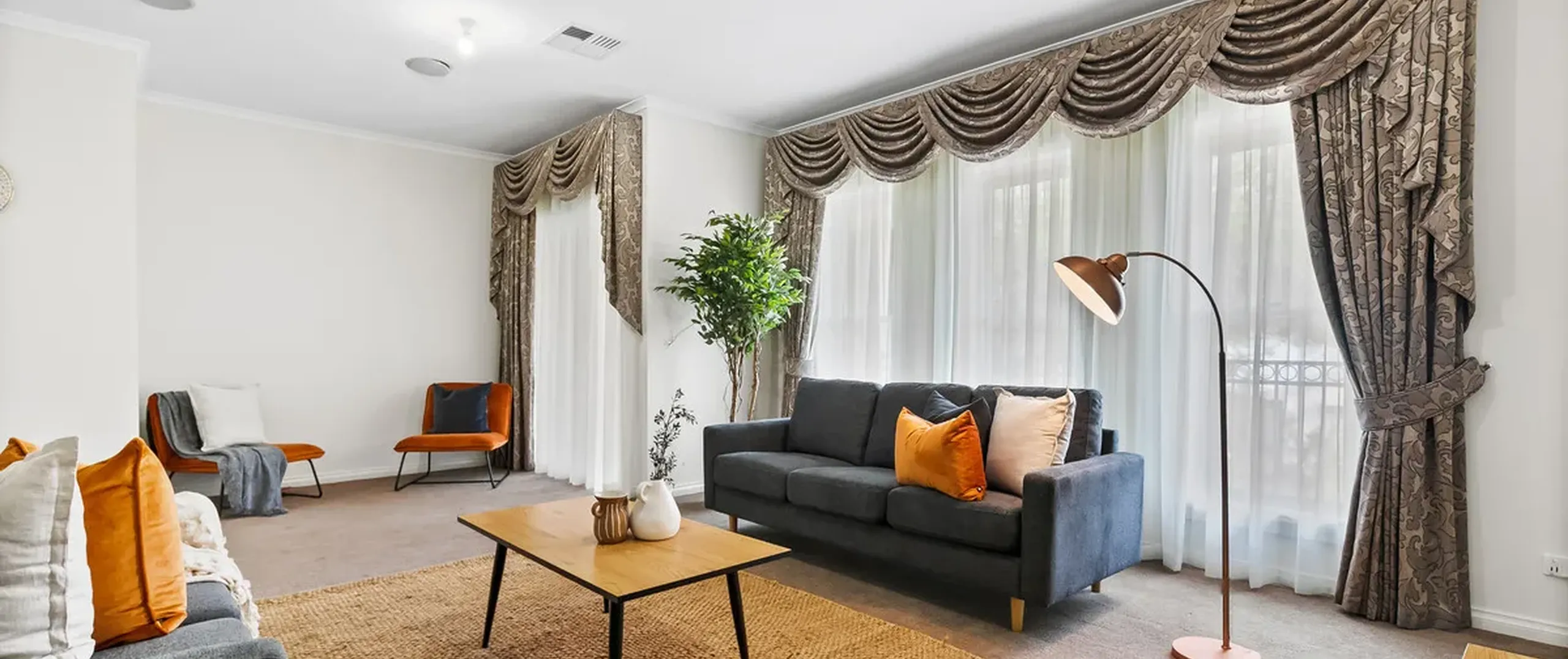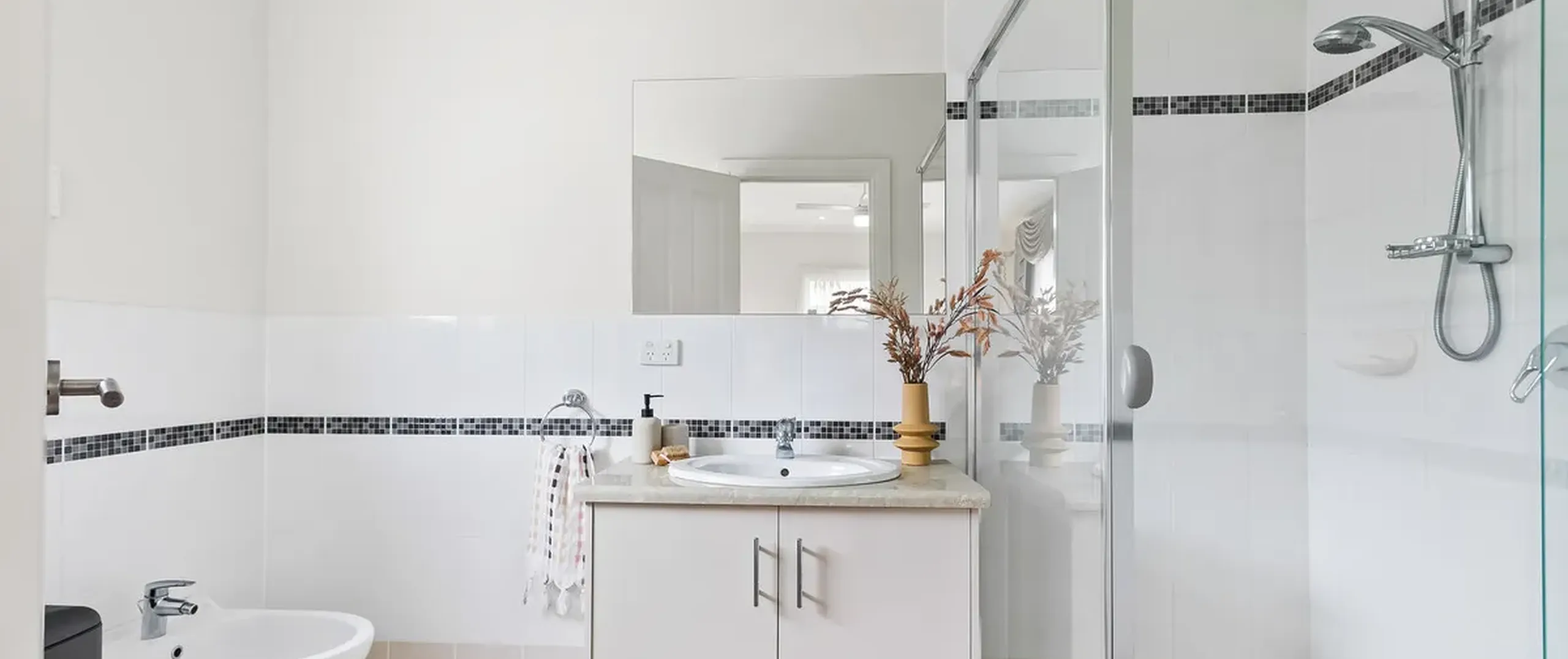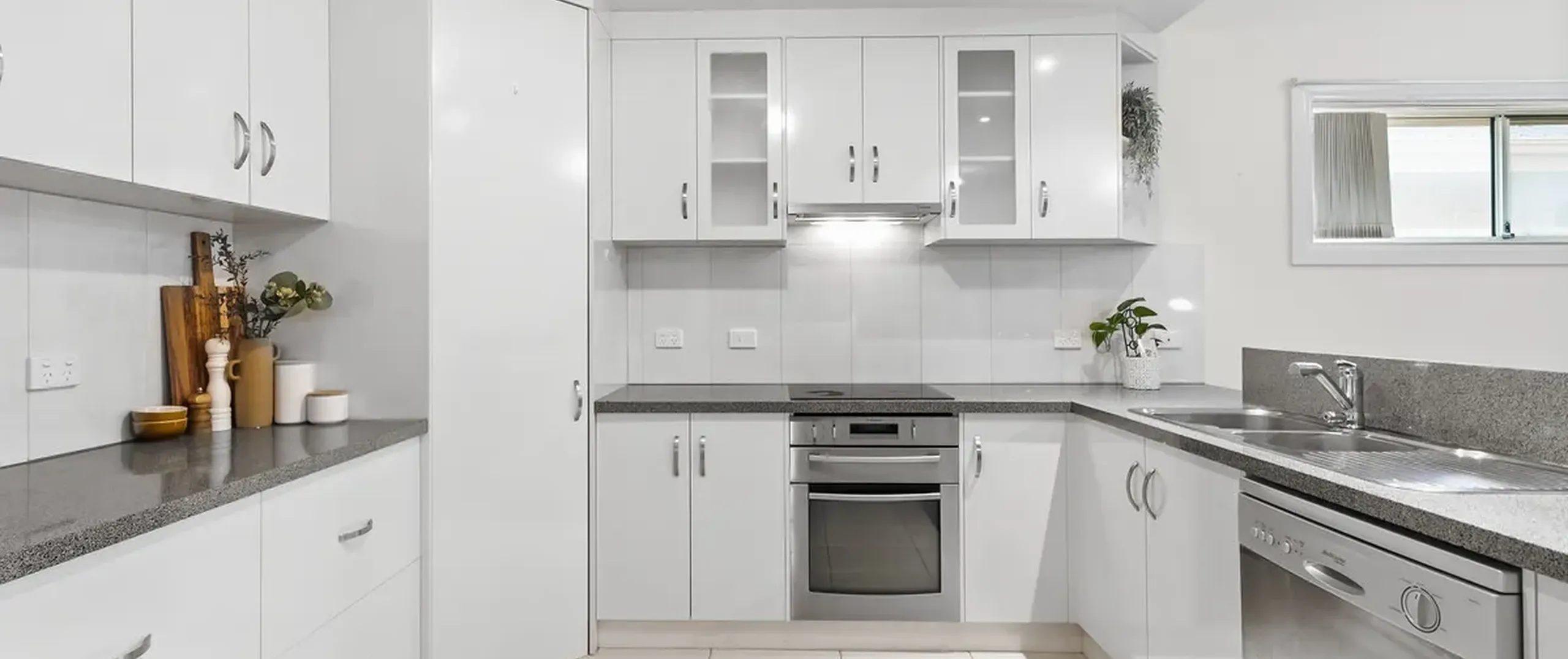 - Immaculate kitchen with stainless-steel appliances including dishwasher, sweeping benchtops, dual sink, pantry and ample cupboard space
