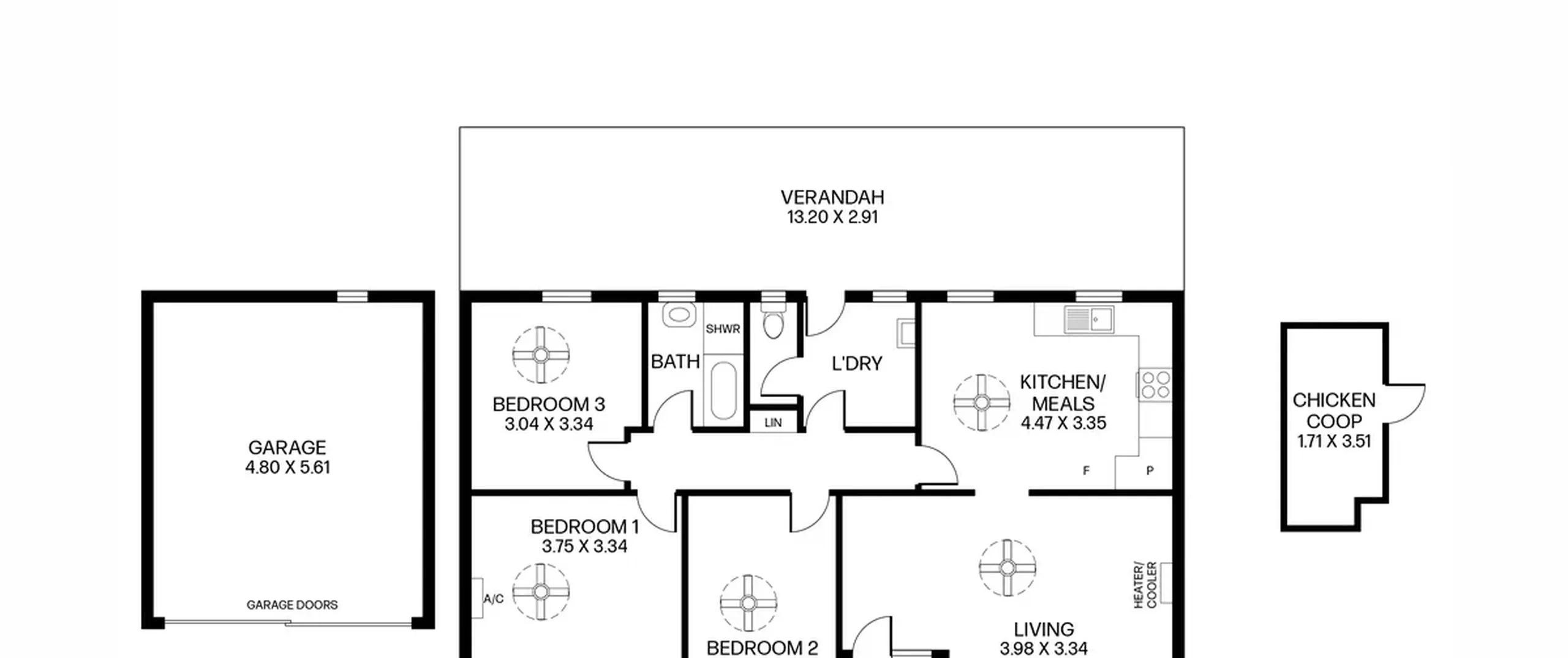 - Open plan kitchen/meals with ceiling fan and ample storage