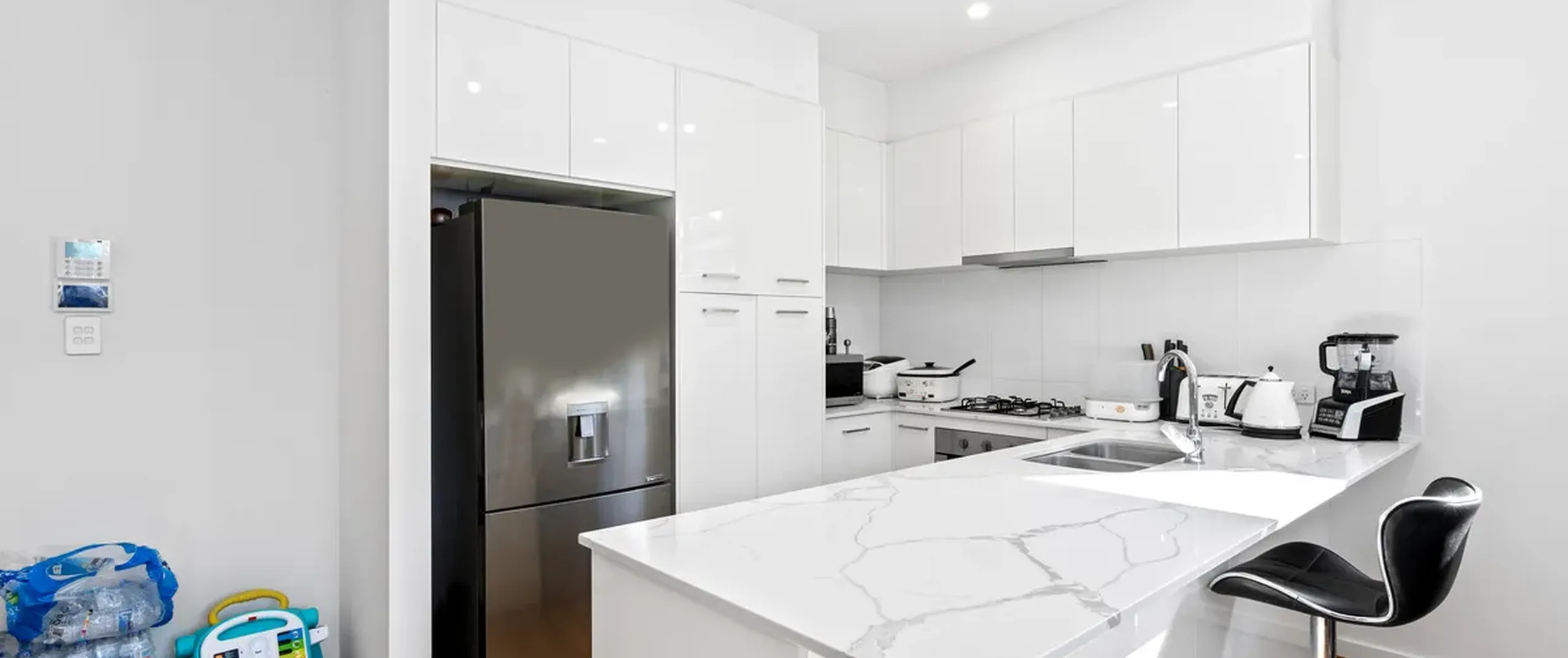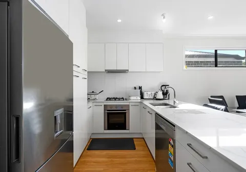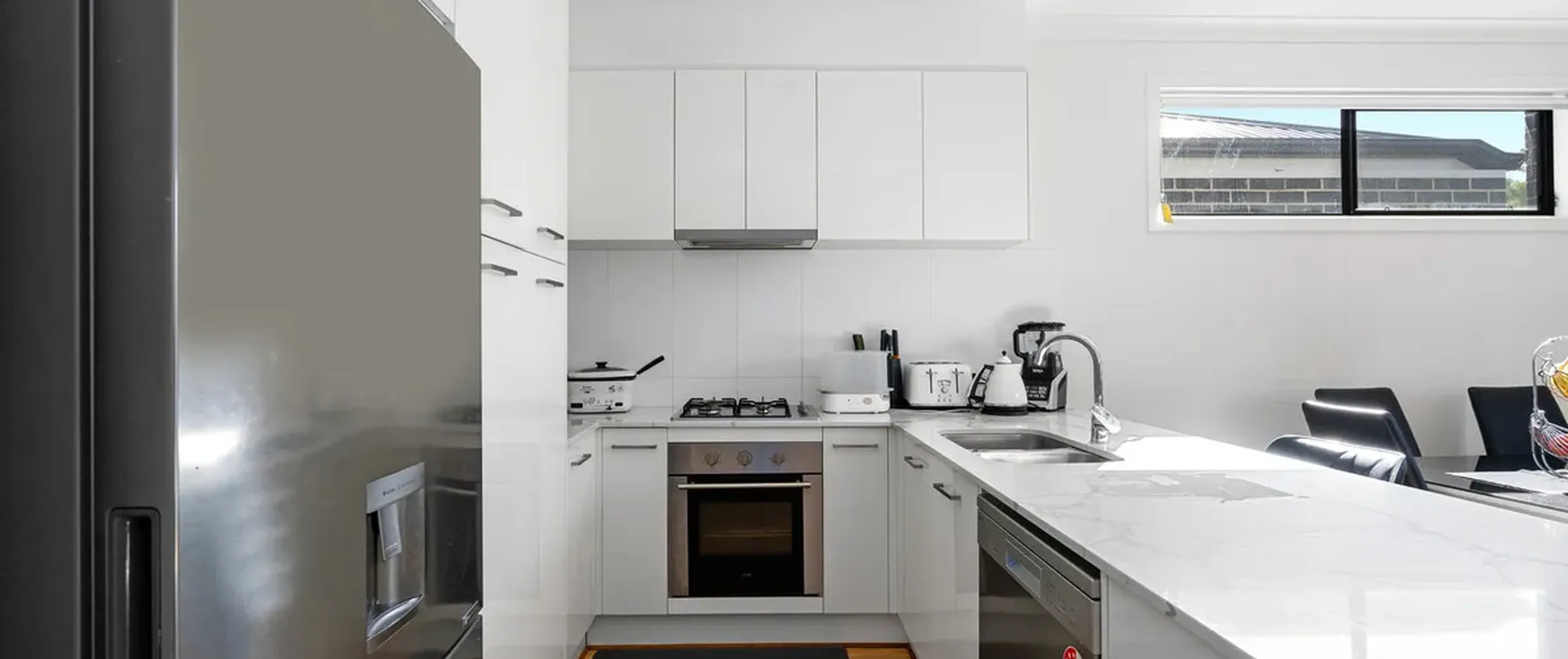 - Sleek white kitchen with quality stainless steel appliances, gas cooktop, dishwasher, ample bench space, pantry and breakfast bar