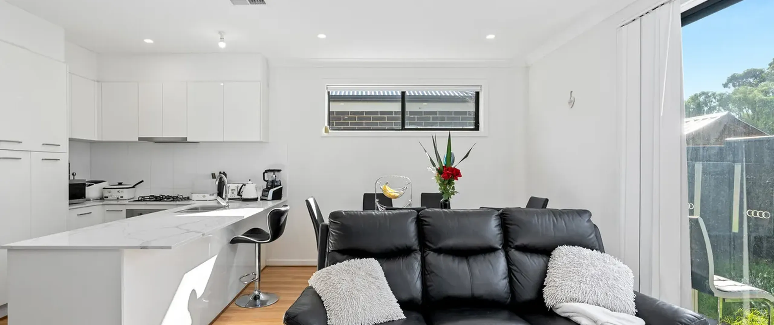 An open plan kitchen, dining and living will be the heart of your day to day living, with a sleek white kitchen, stainless steel appliances and gas stovetop and is complete with ample cupboard and bench space plus breakfast bar!