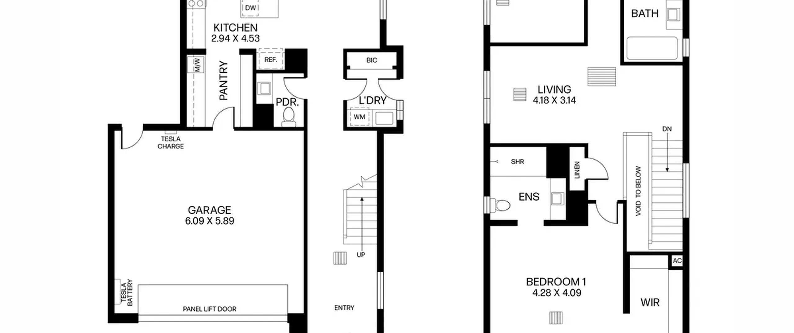 - Double oversized garage housing a Tesla charger and 2 power wall Tesla batteries