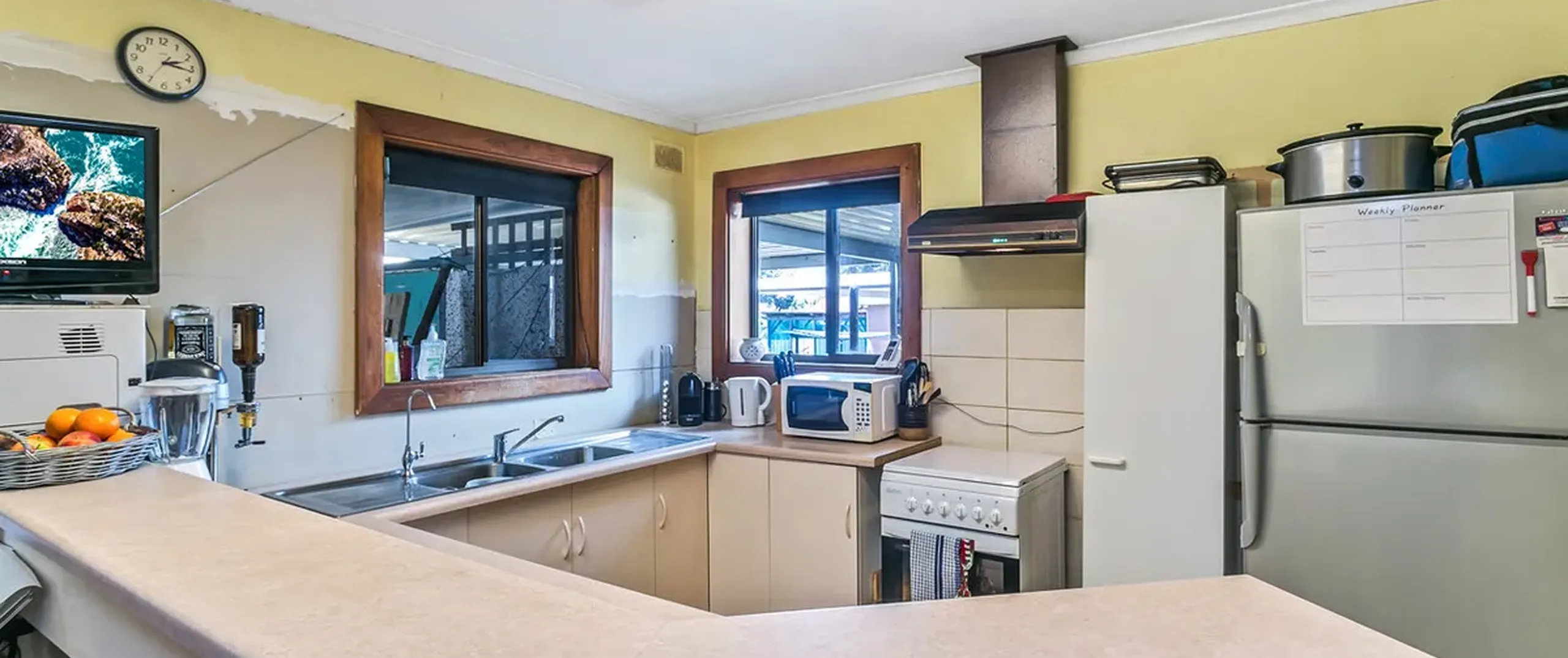 - Neat and tidy kitchen with electric cooktop + ample bench and cupboard space