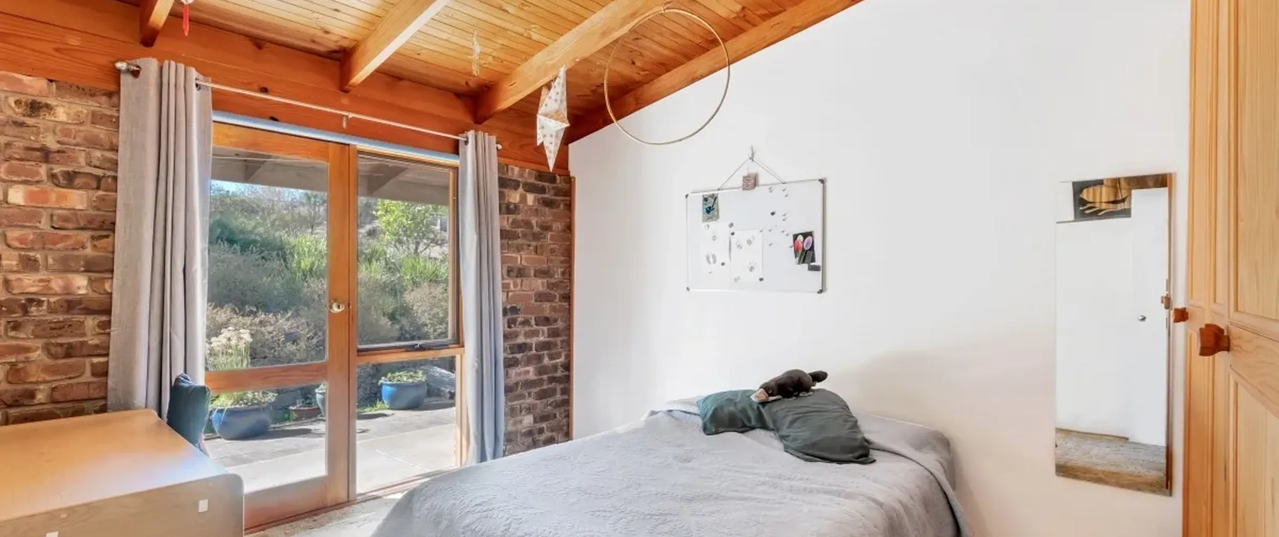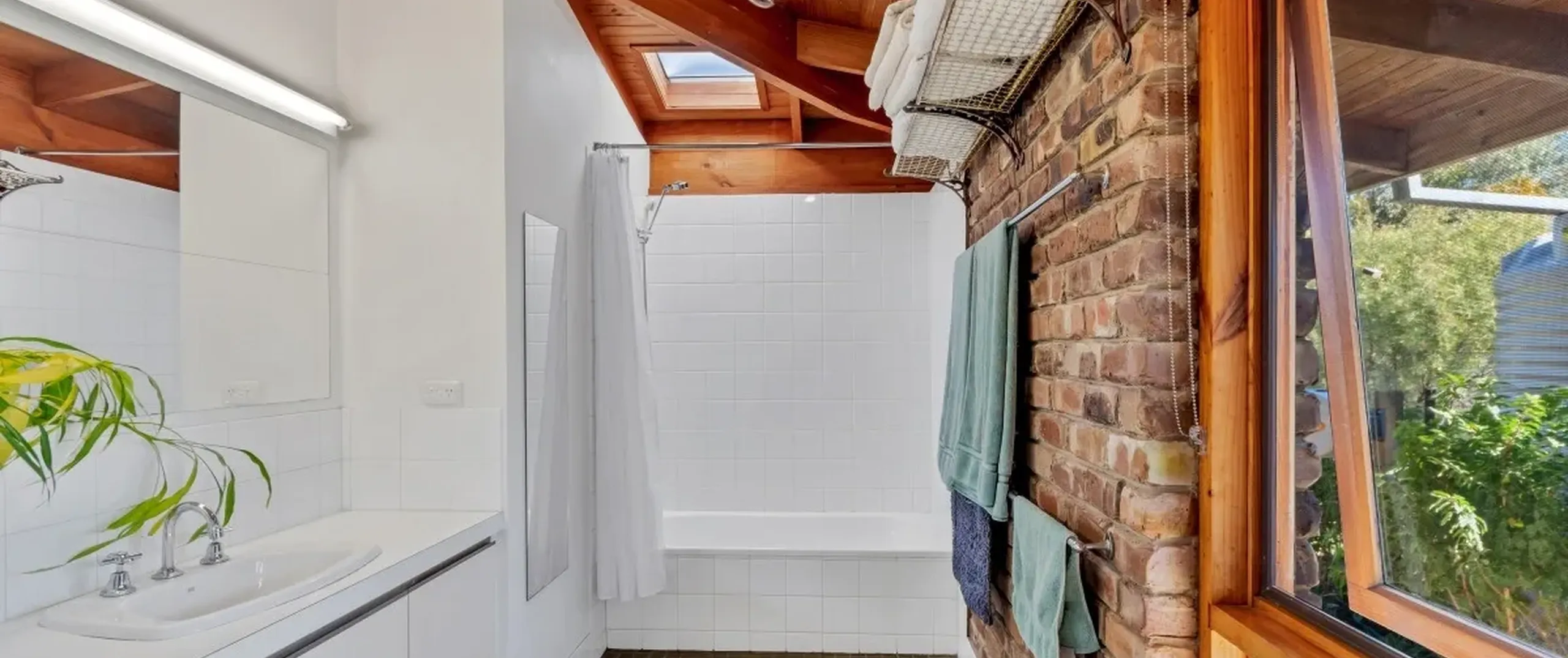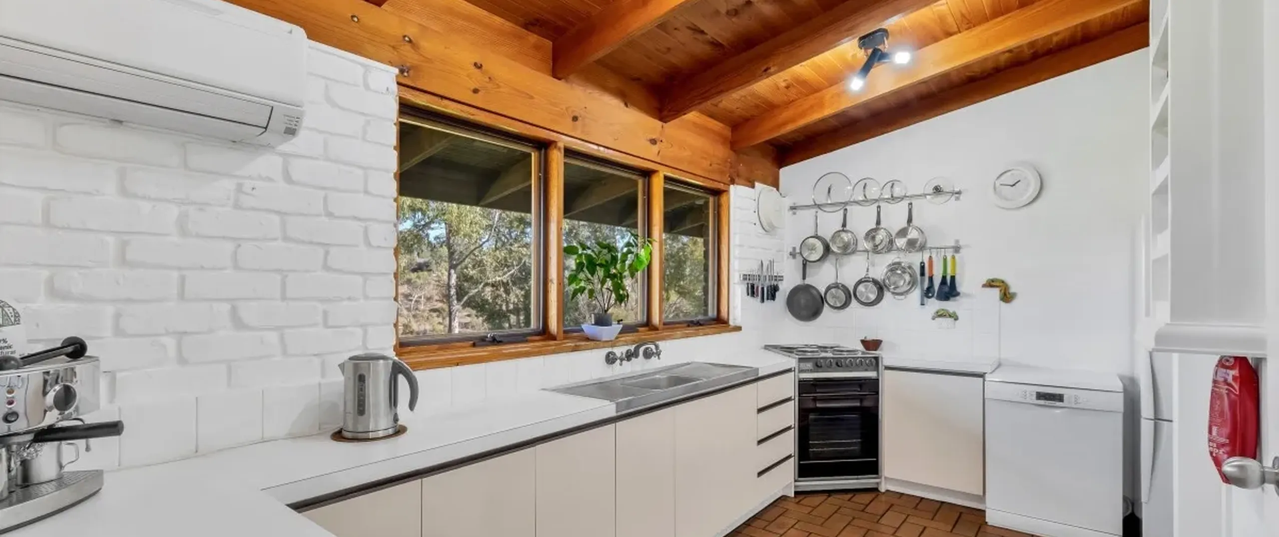 - Exposed brick walls throughout, high ceilings and timber beams creating a rustic ambience and feeling of space