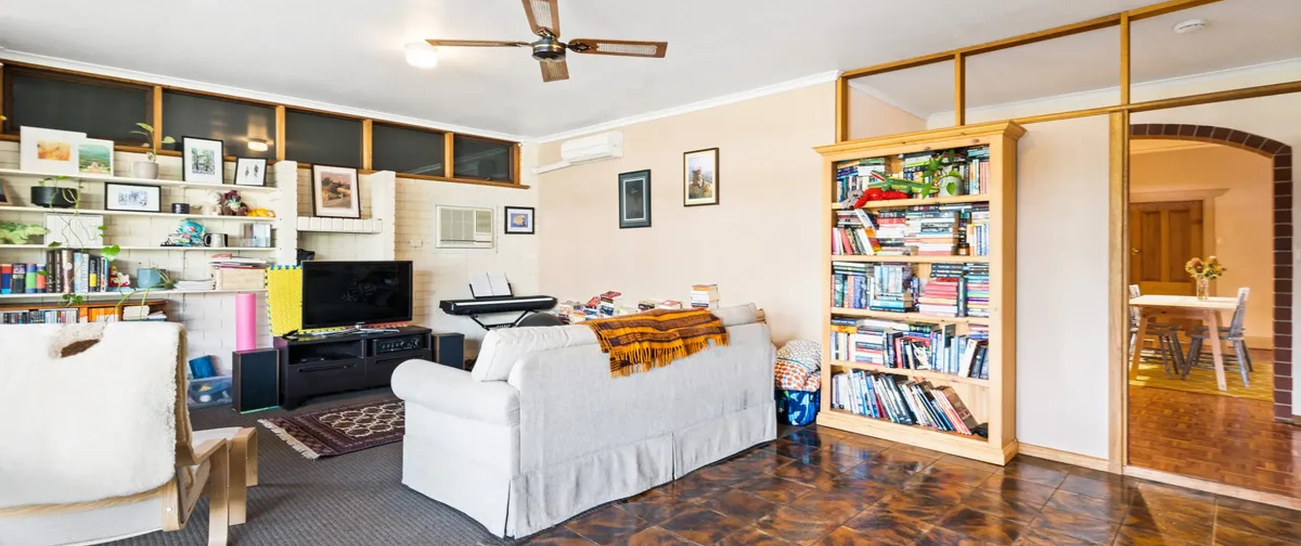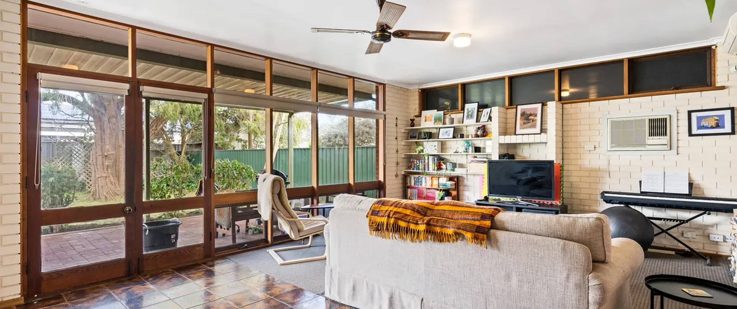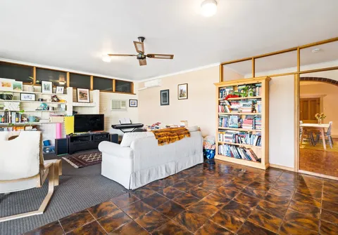 - Expansive lounge room with air conditioner, ceiling fan and built-in shelving