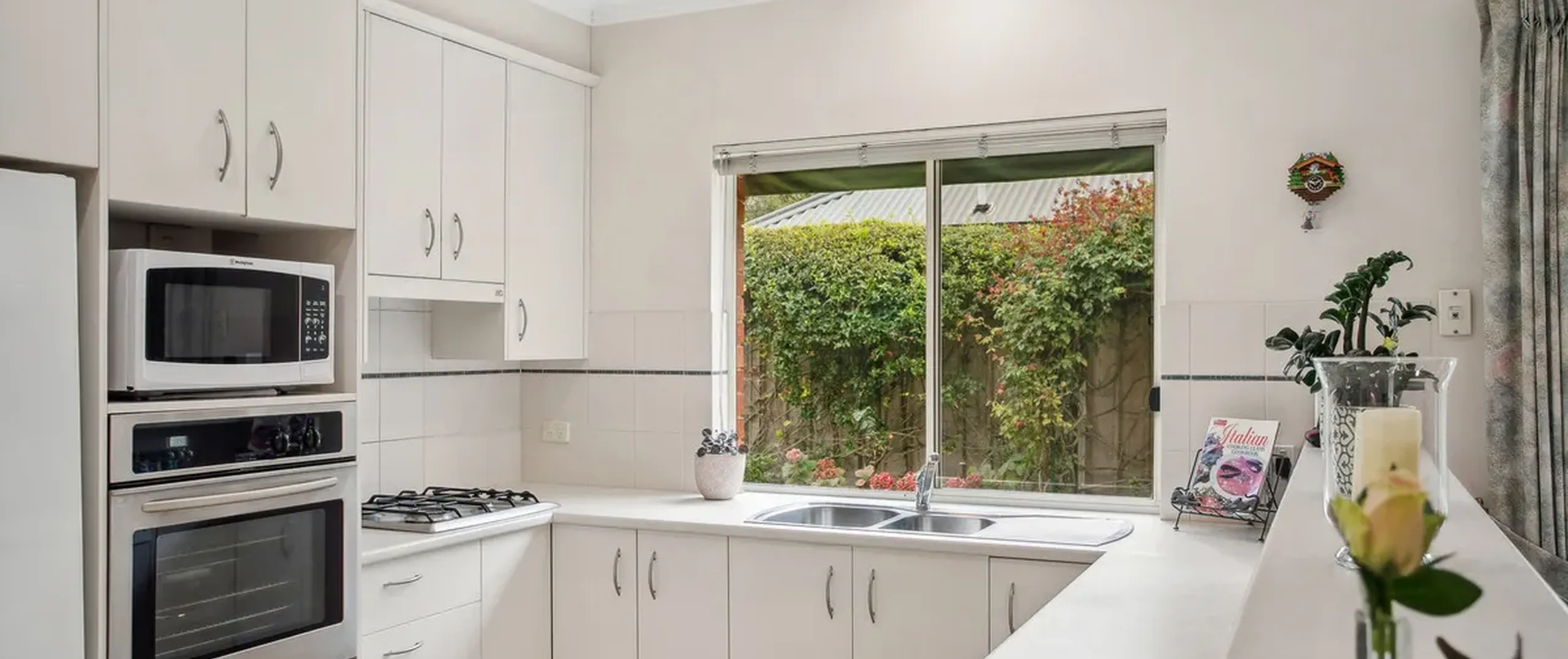 - Timeless white kitchen with gas cook top, electric oven and cupboard and bench space