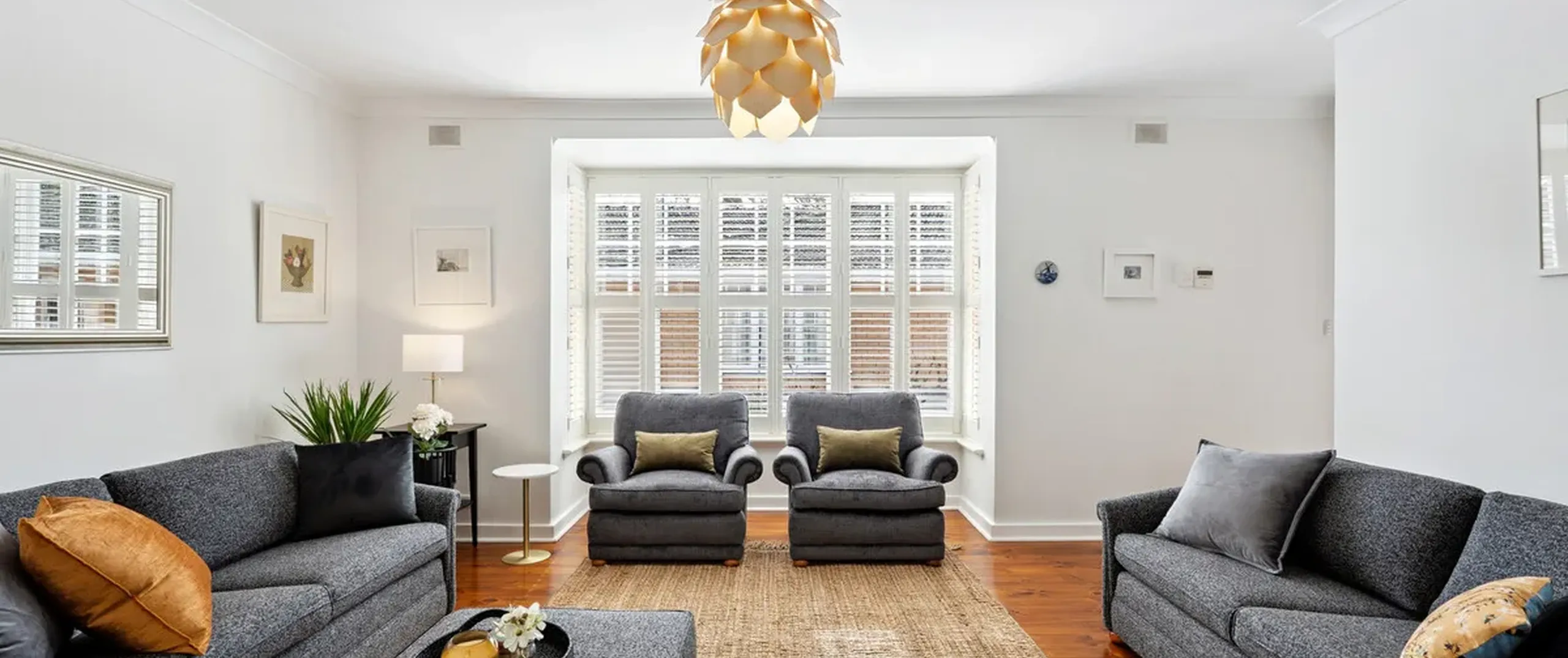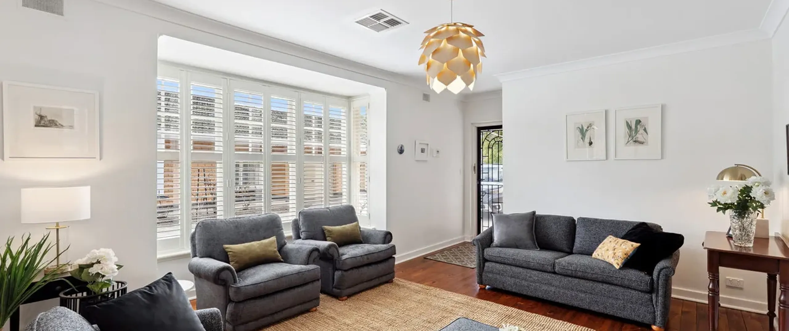 - Light filled lounge with bay window featuring plantation shutters