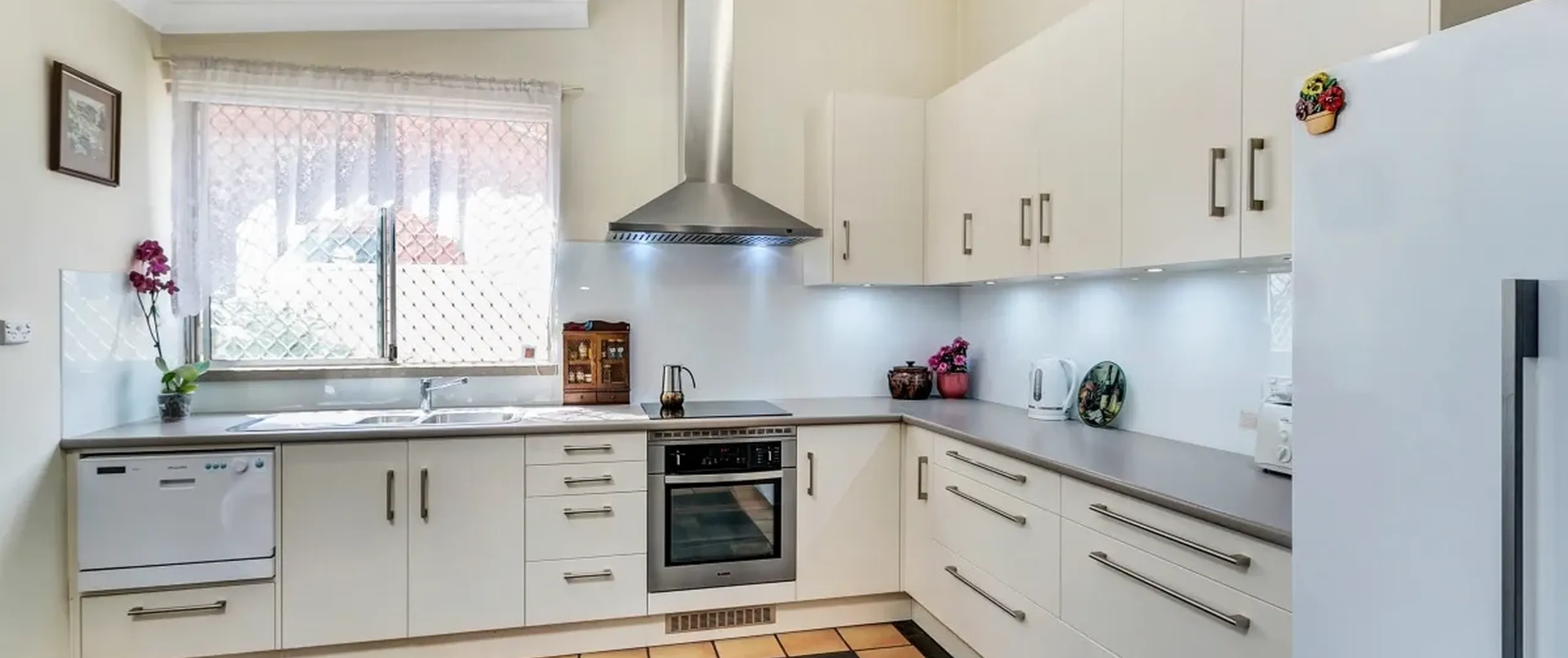 - Modern kitchen with stainless steel appliances, ample bench and cupboard space, induction cooktop, compact dishwasher, skylight, ceiling fan and split system reverse cycle air conditioner