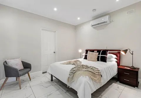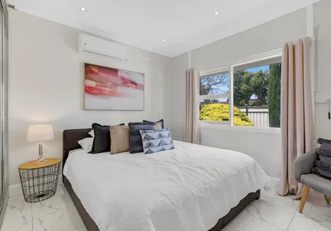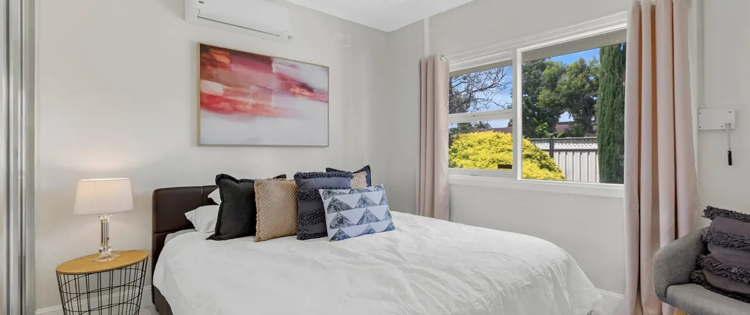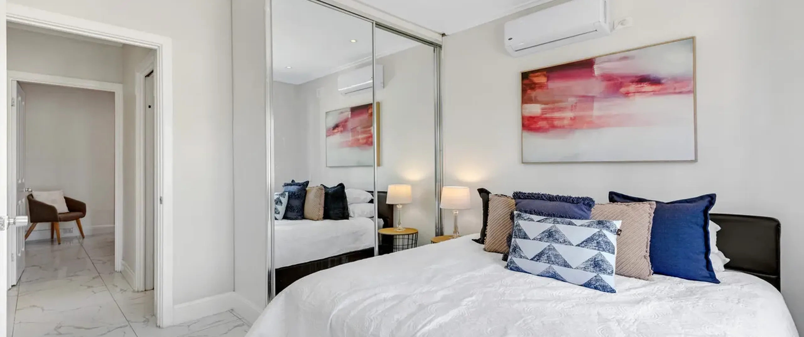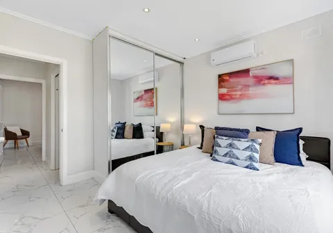 - Bedroom 1 with split system air conditioner, built-in robe and two-way ensuite
