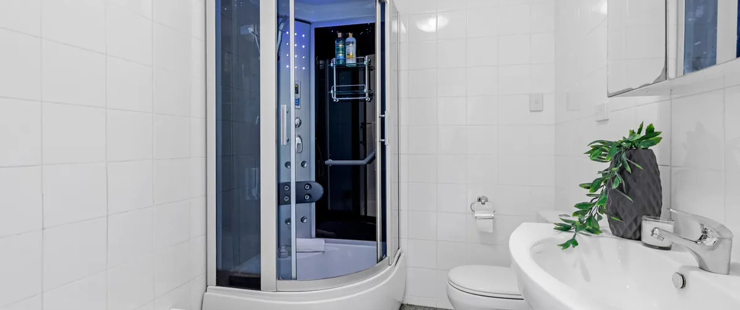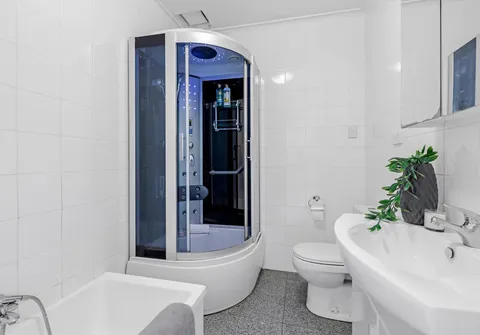 - Contemporary main bathroom complete with bath, separate futuristic shower with back jet massagers, rain shower and convertible steam room, and floor to ceiling tiles