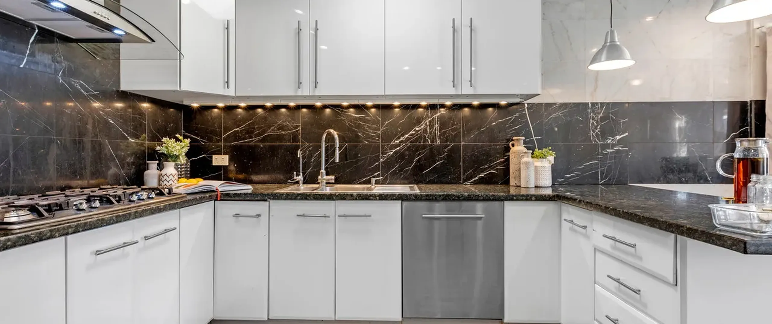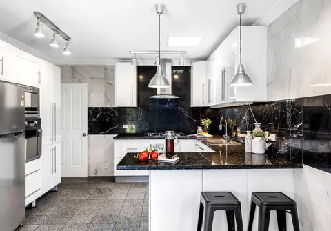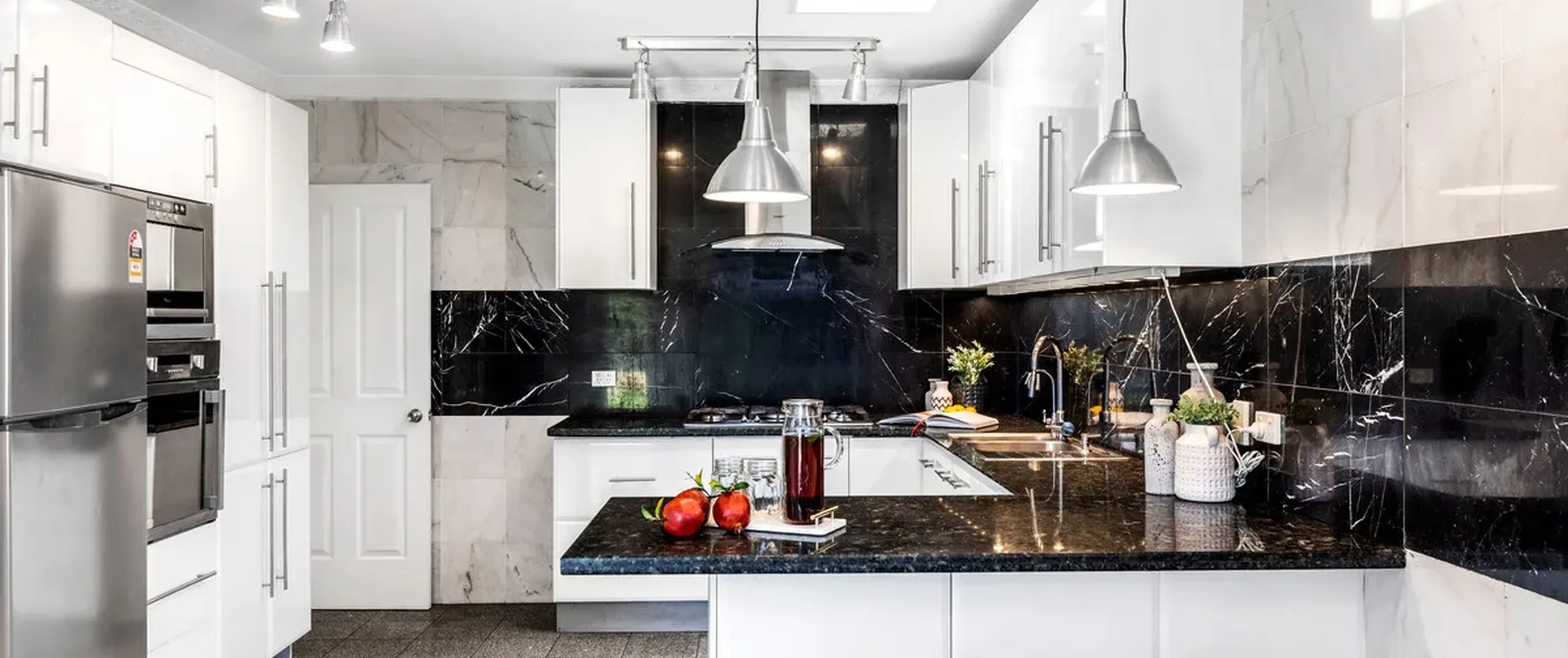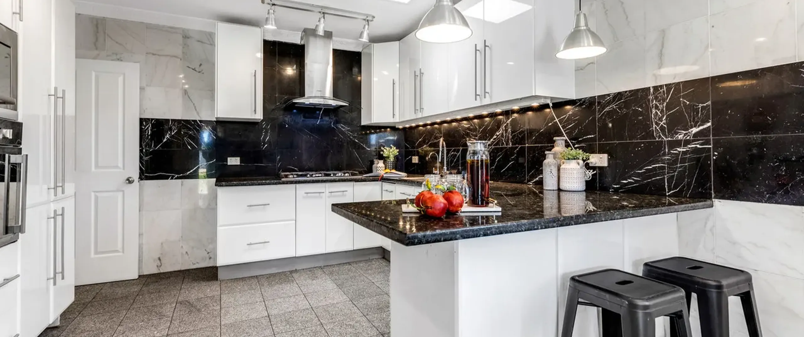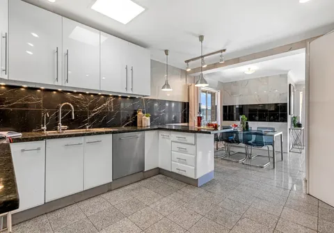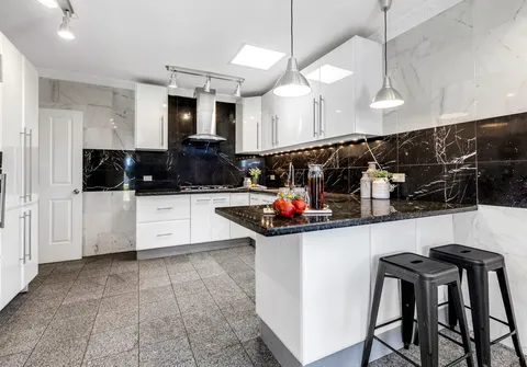 - Stylish modern kitchen featuring granite benchtops, floor to ceiling marble tiles extending to dining area, band new stainless steel rangehood, 5 burner cook top, walk-in pantry, second pantry, plenty of cupboards, bench top lights, breakfast bar, skylight, Puratap and stainless steel appliances including built-in microwave and dishwasher