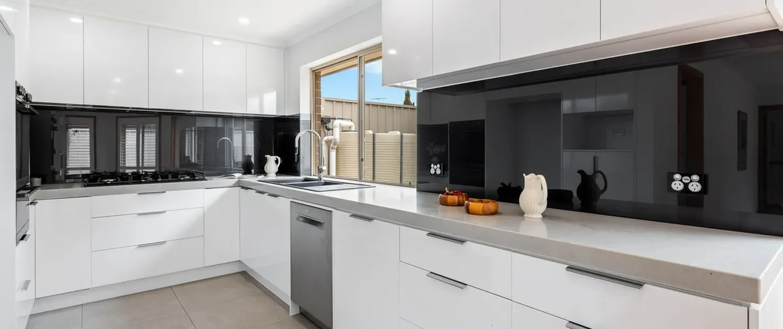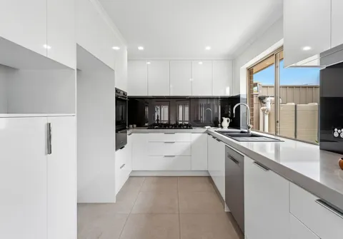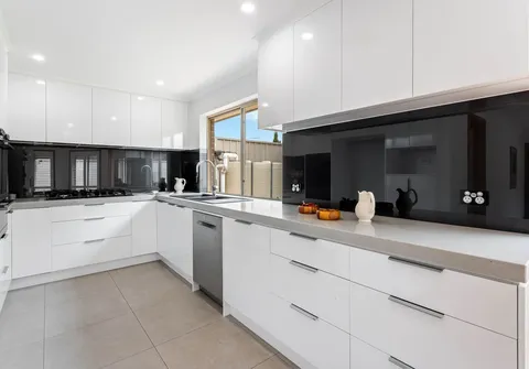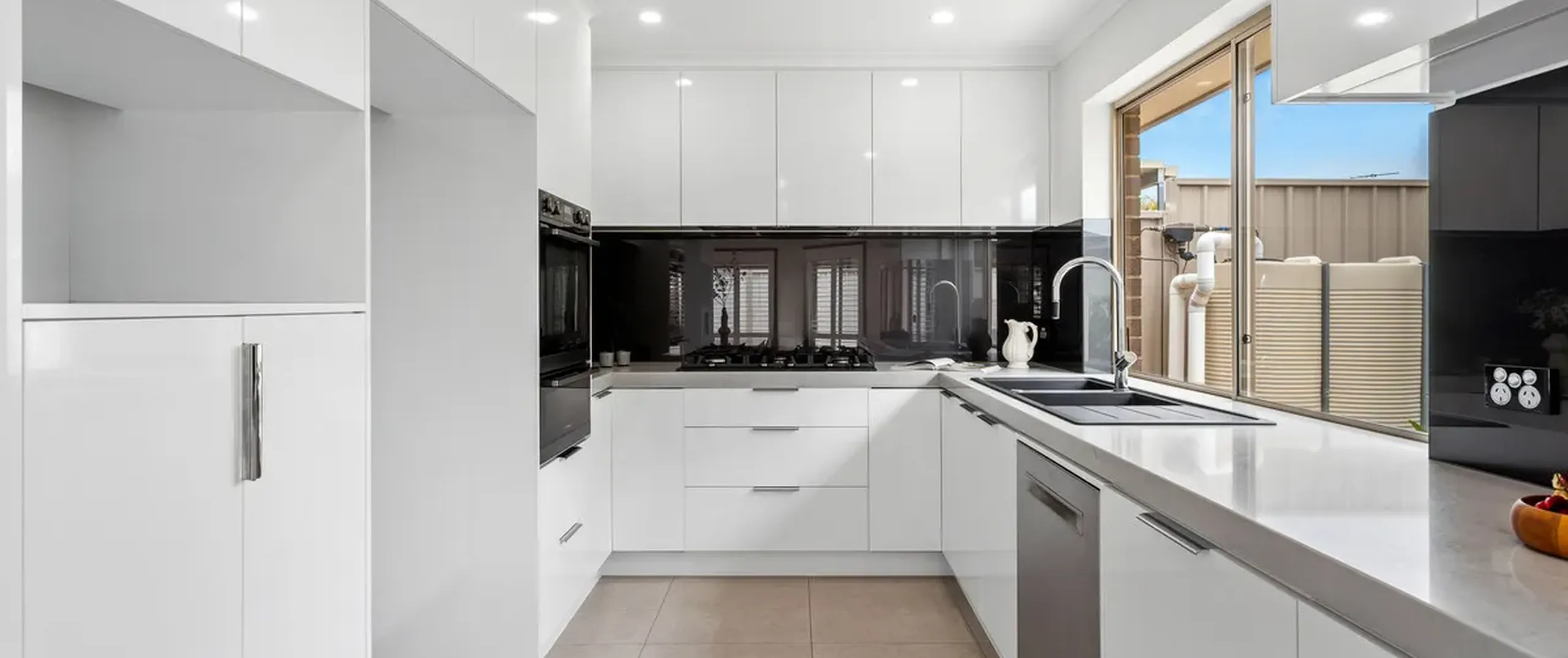 - Modern white kitchen with 90cm cooktop, oven, dual sinks, stainless steel dishwasher and plenty of storage