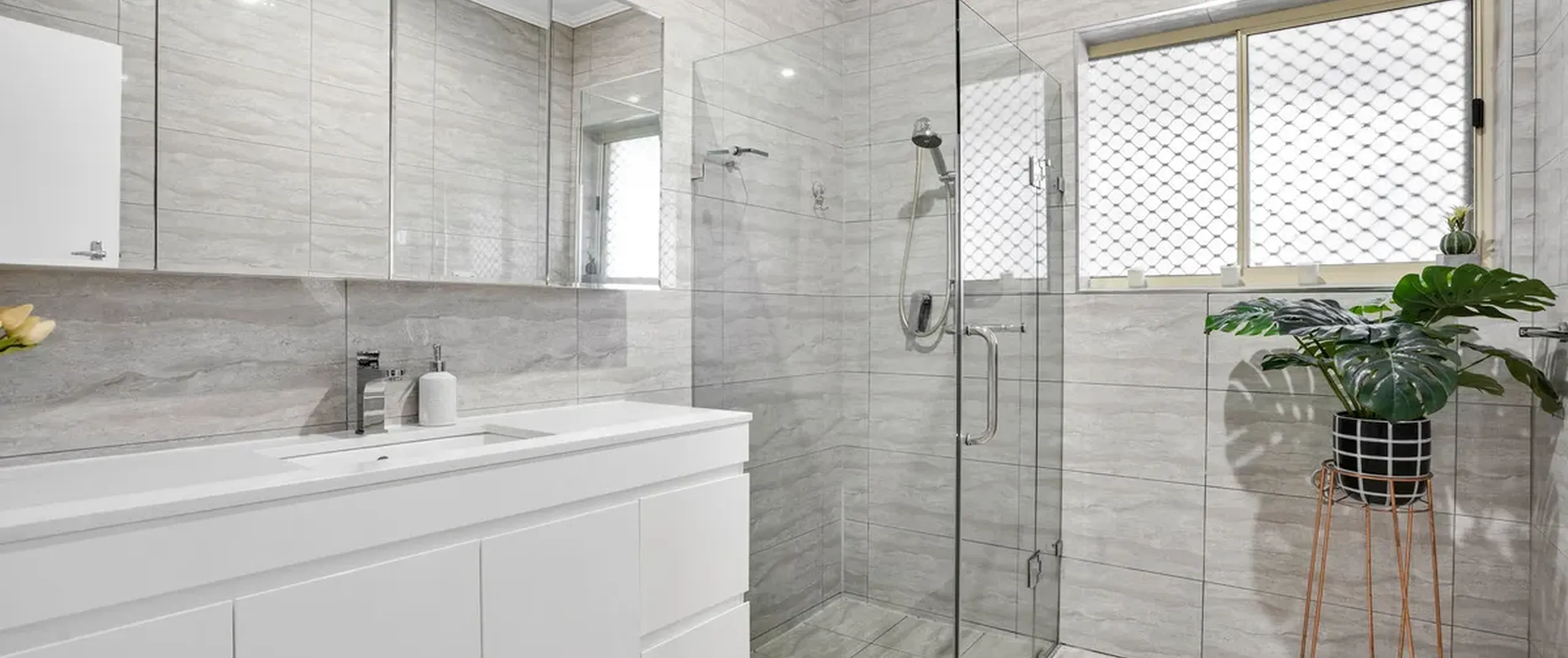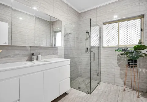 - Main bathroom with modern floor to ceiling tiles and stone vanity top