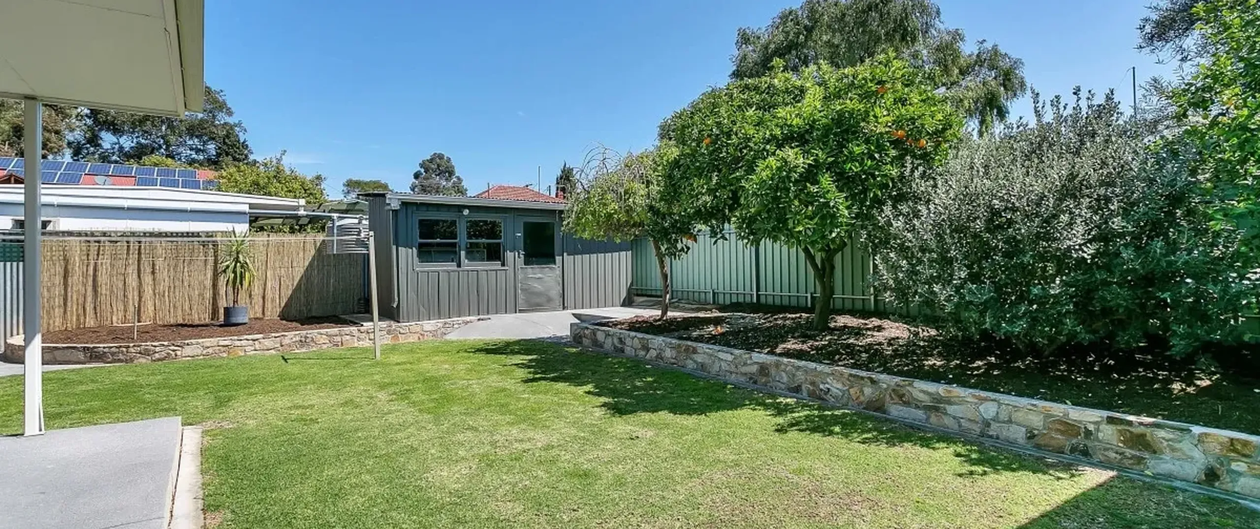 - Fully fenced, low maintenance rear yard with fruit trees and workshop