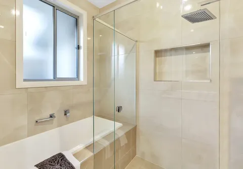 - Stunning main bathroom with quality fittings, separate bath and shower + separate toilet and full height tiling