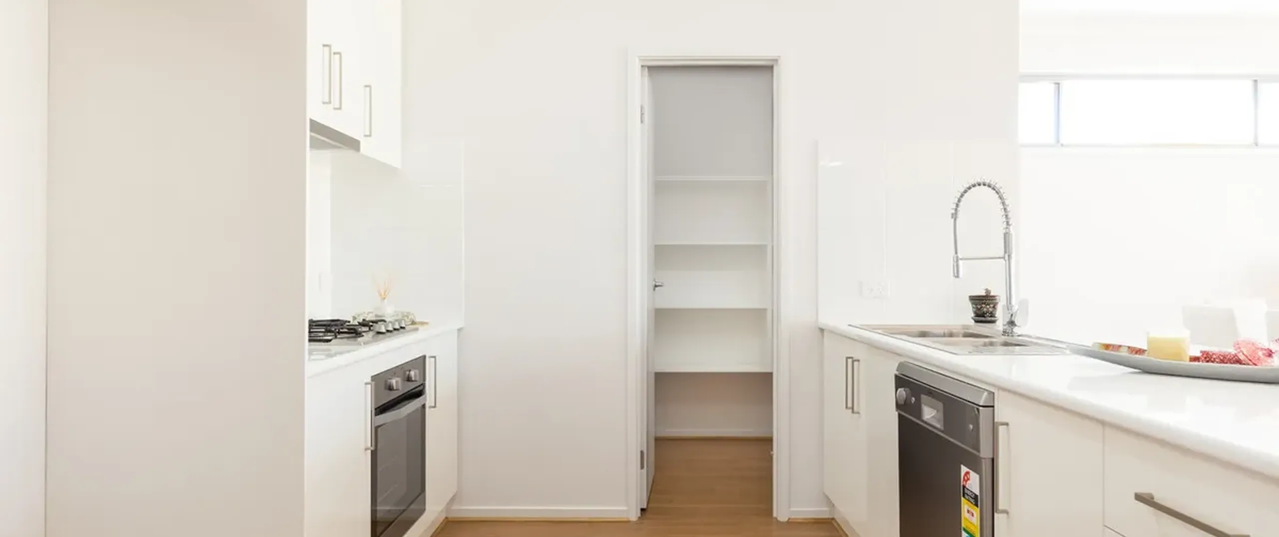 - Modern kitchen with stainless steel appliances, gas cooktop, dishwasher, breakfast bar and walk-in pantry