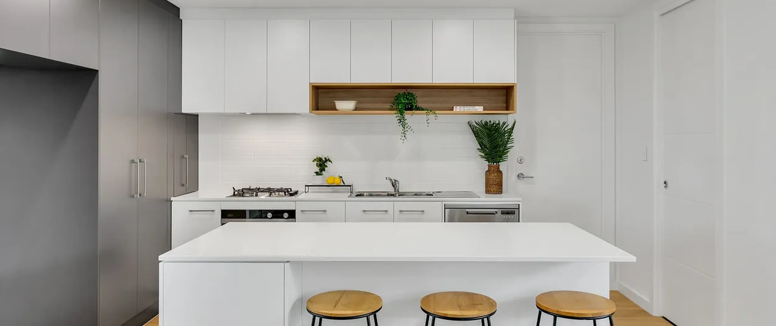 - Galley style modern kitchen featuring stainless steel appliances, stone benchtop, dishwasher, feature cabinetry and breakfast bar