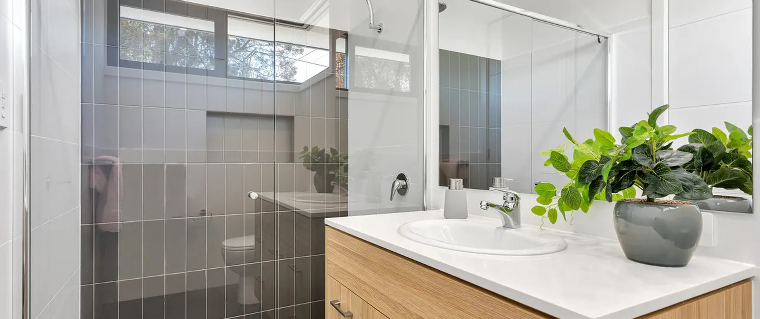 - Master bedroom with built in robe and ensuite featuring tiled shower niche, feature tiles and stone benchtop