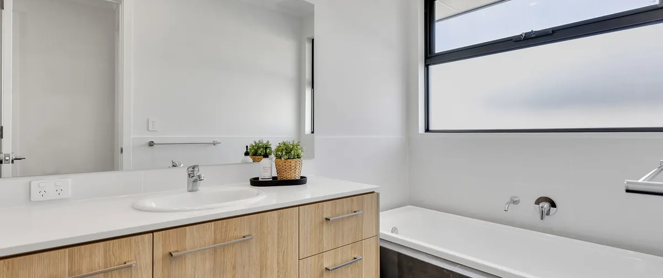 - Stylish main bathroom with stone benchtop and separate bath/shower area