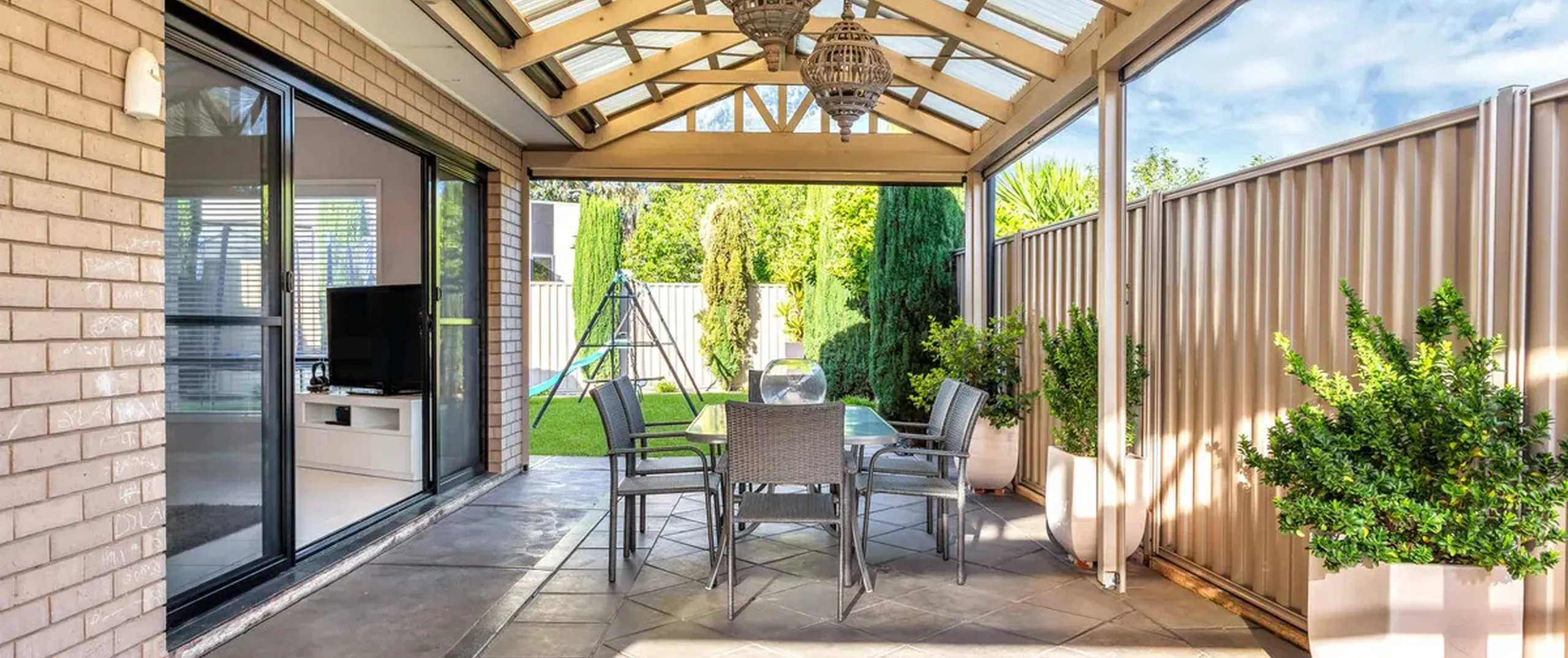 - Paved pergola with pitched roof and tracked screens, perfect for year round outdoor entertaining