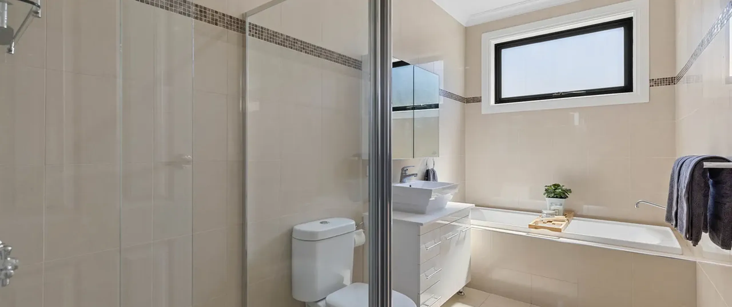 - Modern main bathroom with floor to ceiling tiles, plus separate bath and shower