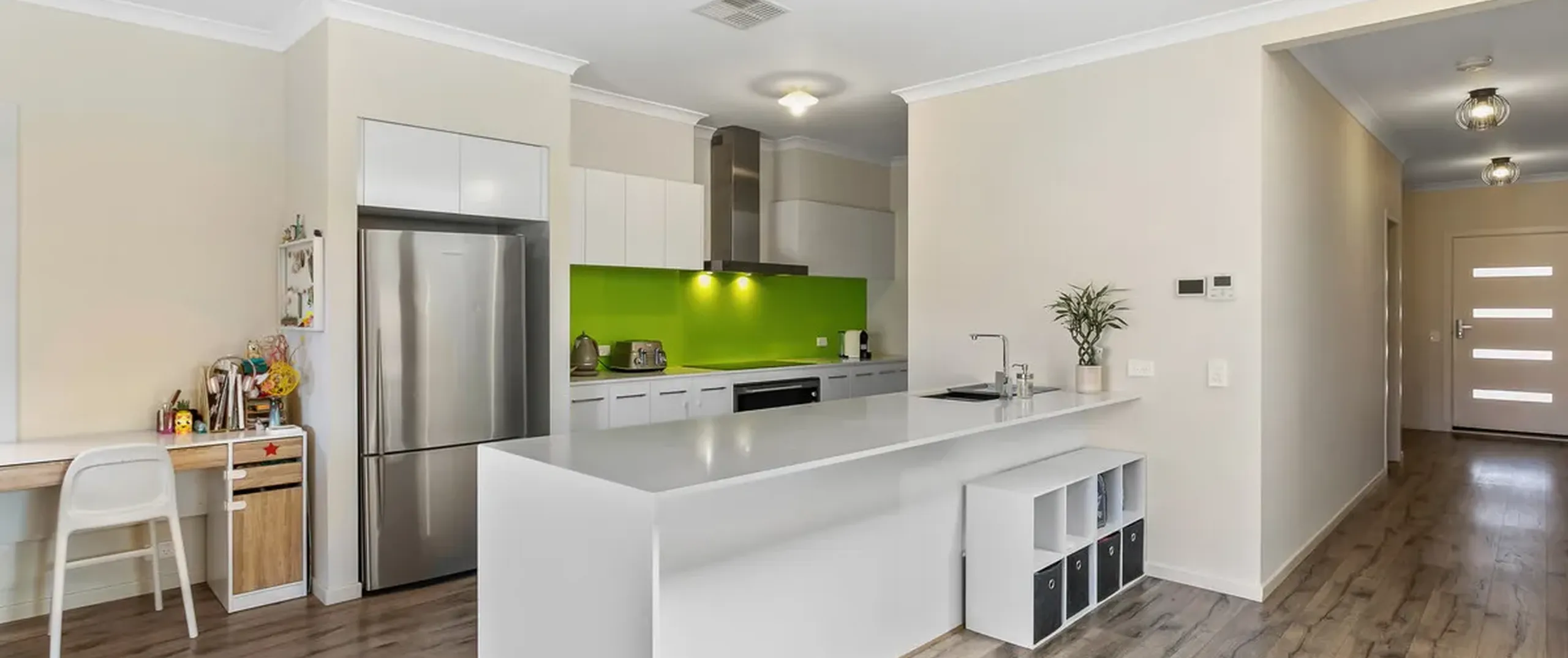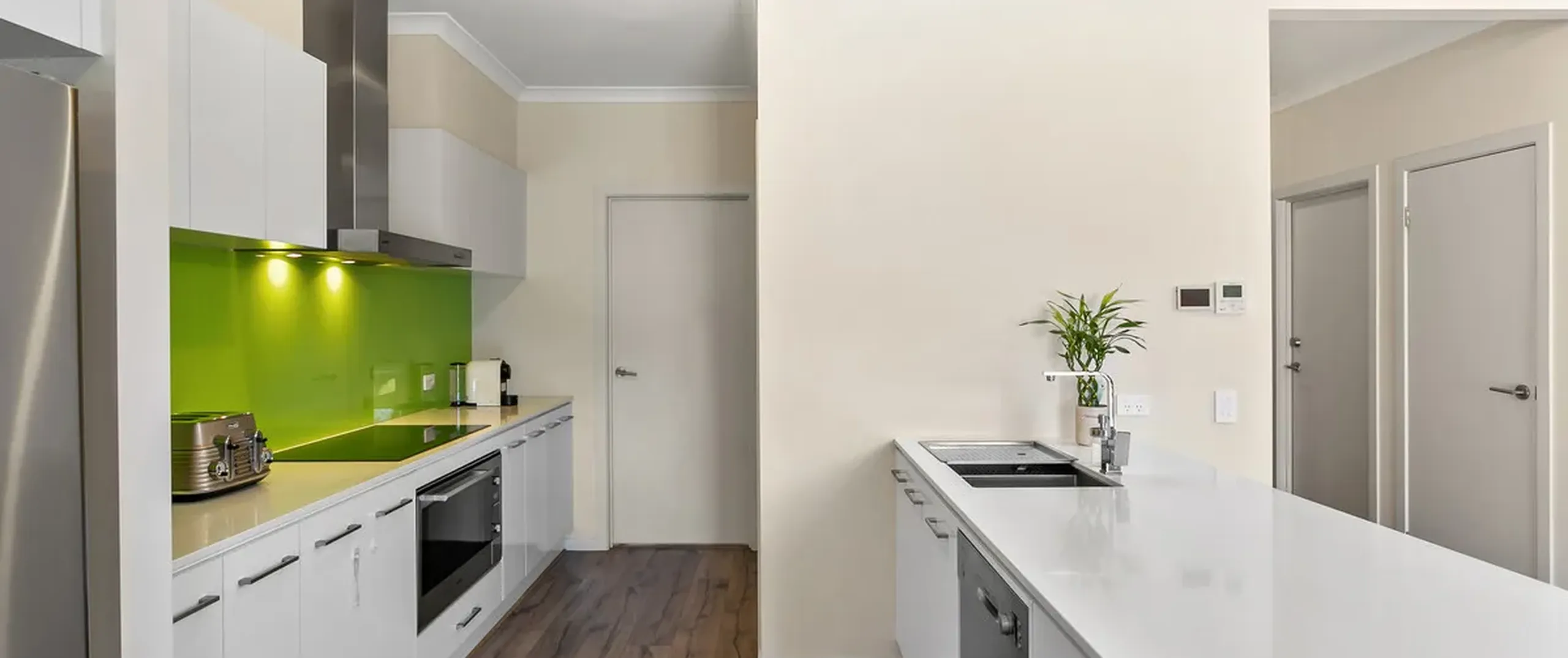 - Kitchen with walk in pantry, induction cooktop, Caesar stone benchtops, and Bosch dishwasher