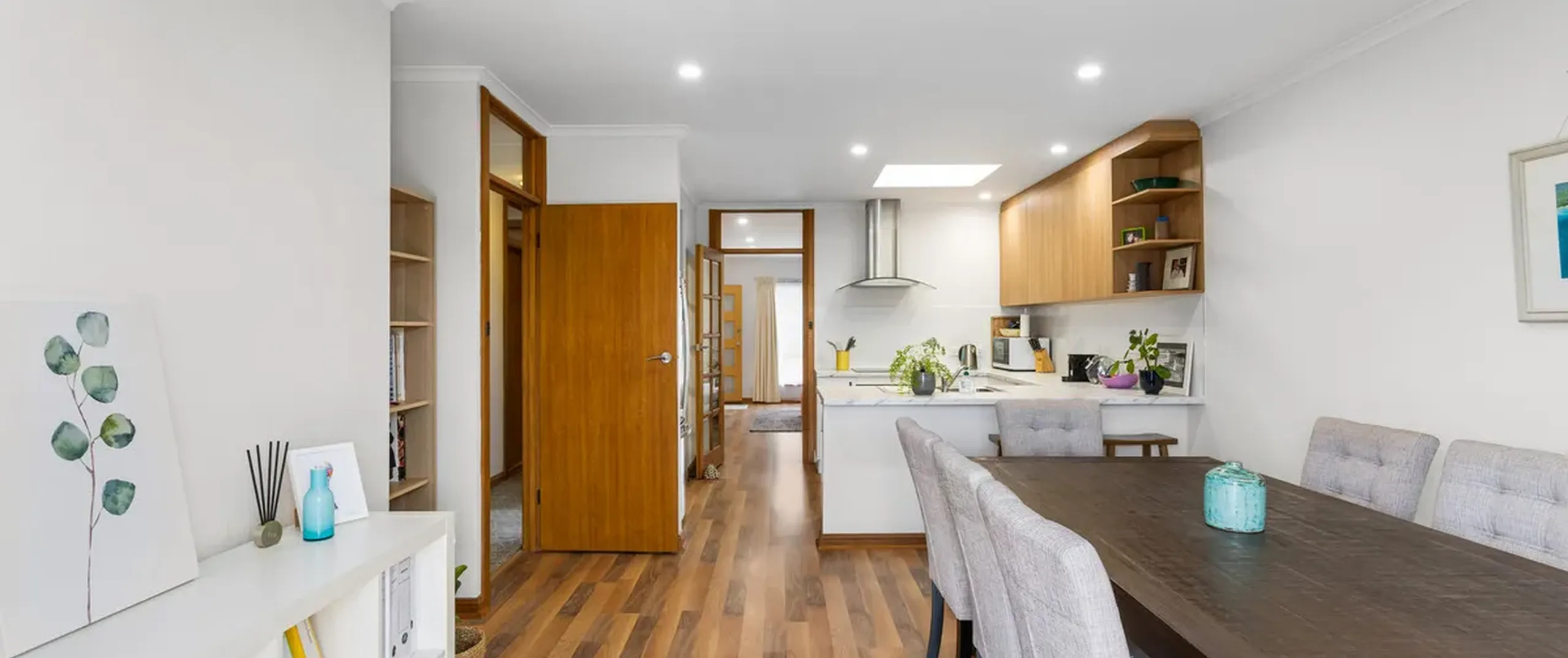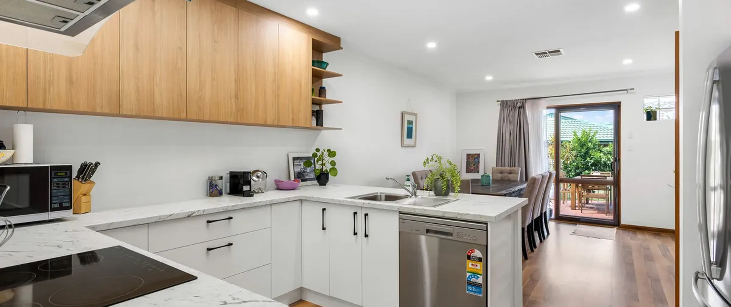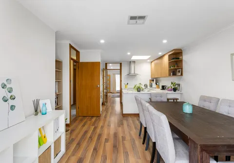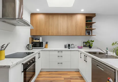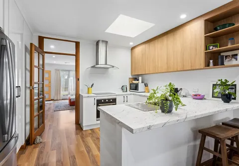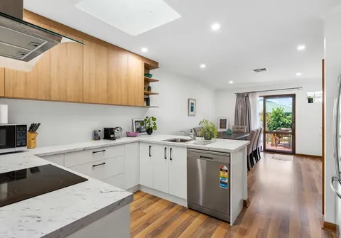 - Light-filled open plan kitchen and dining area with skylight, opening to the backyard creating a seamless flow between the indoors and outdoors