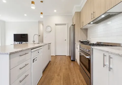 The heart of this residence resides in the open-plan living, dining, and kitchen area. Prepare to be inspired in the sleek and contemporary kitchen, boasting expansive countertops adorned with stylish pendant lighting, a tiled splashback, and a 900mm gas cooktop and oven. The timeless colour palette adds a touch of refinement, while the walk-in pantry enhances both convenience and organisation.