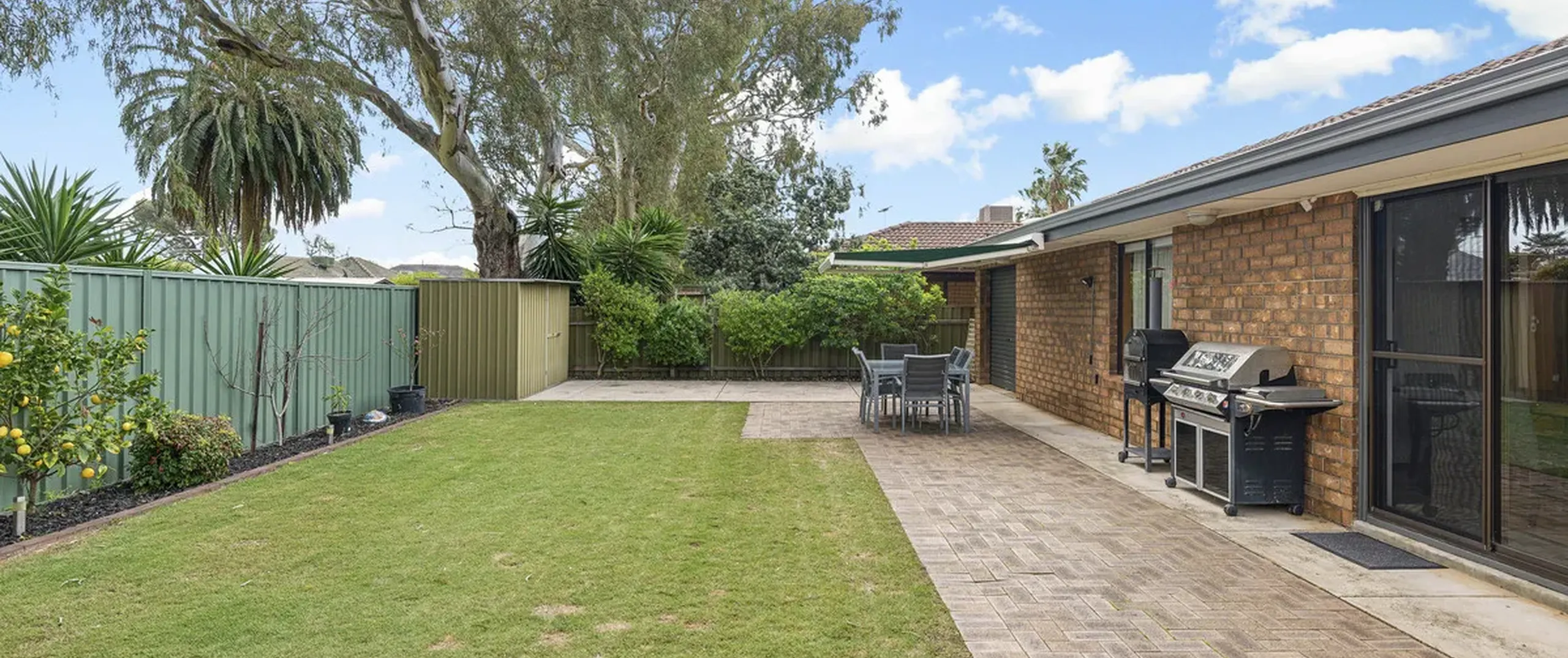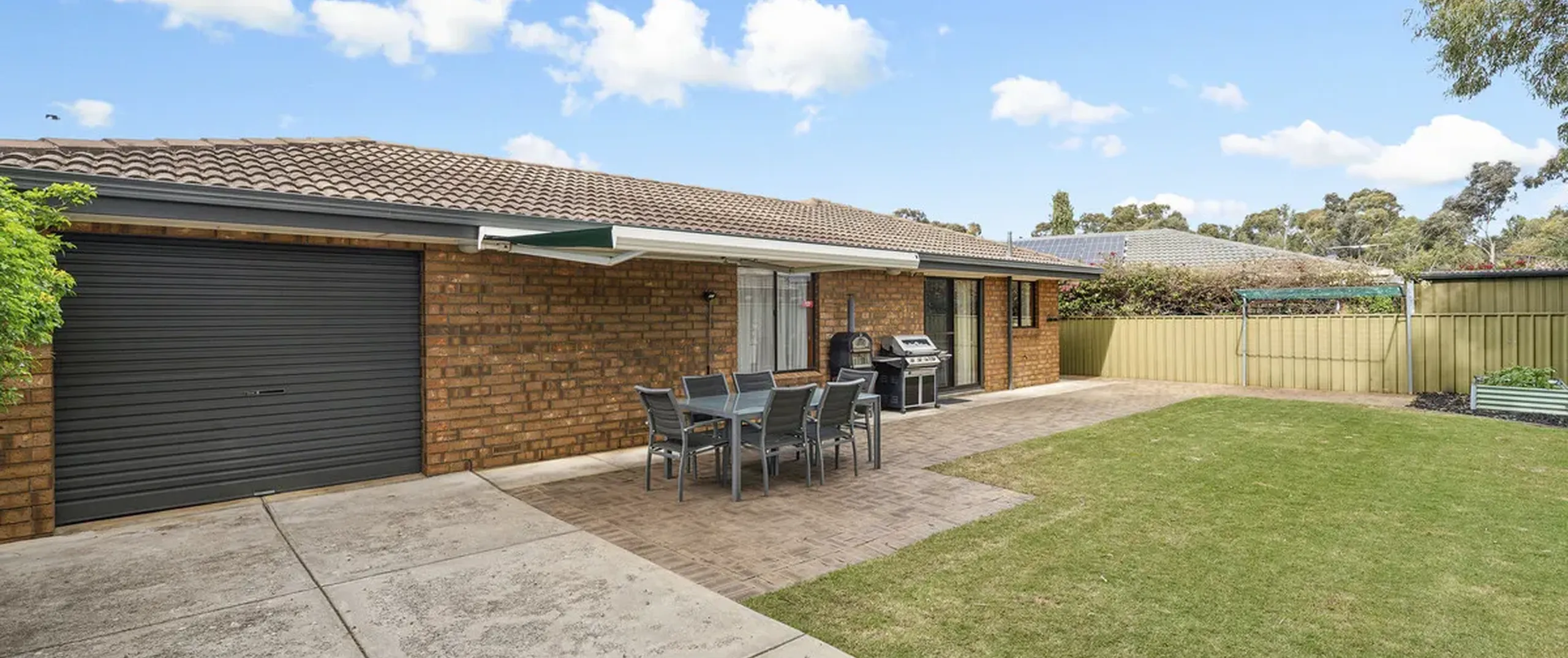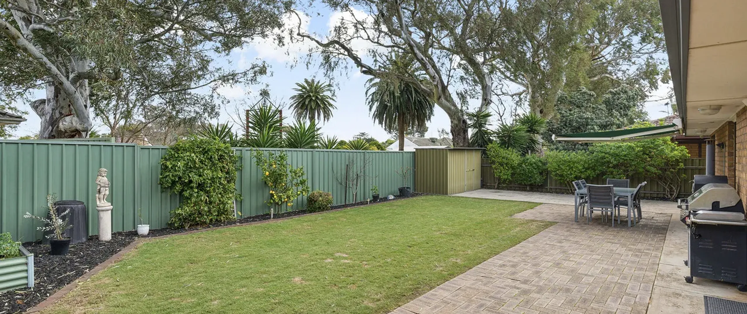 - Low-maintenance backyard with a paved open space and retractable awning surrounded by a well-manicured garden and lush green lawn