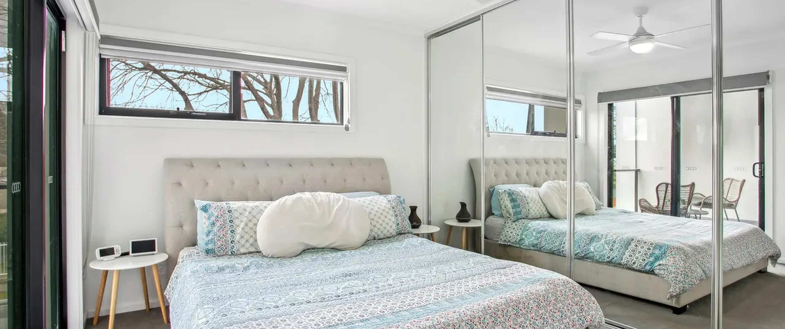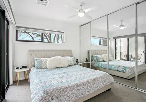 - Master bedroom with built-in robe, ceiling fan, ensuite, and sliding door access to the balcony