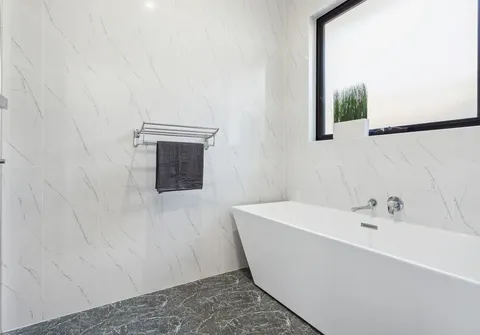 - Main bathroom with contemporary flair, including a powder room, freestanding tub, and separate toilet