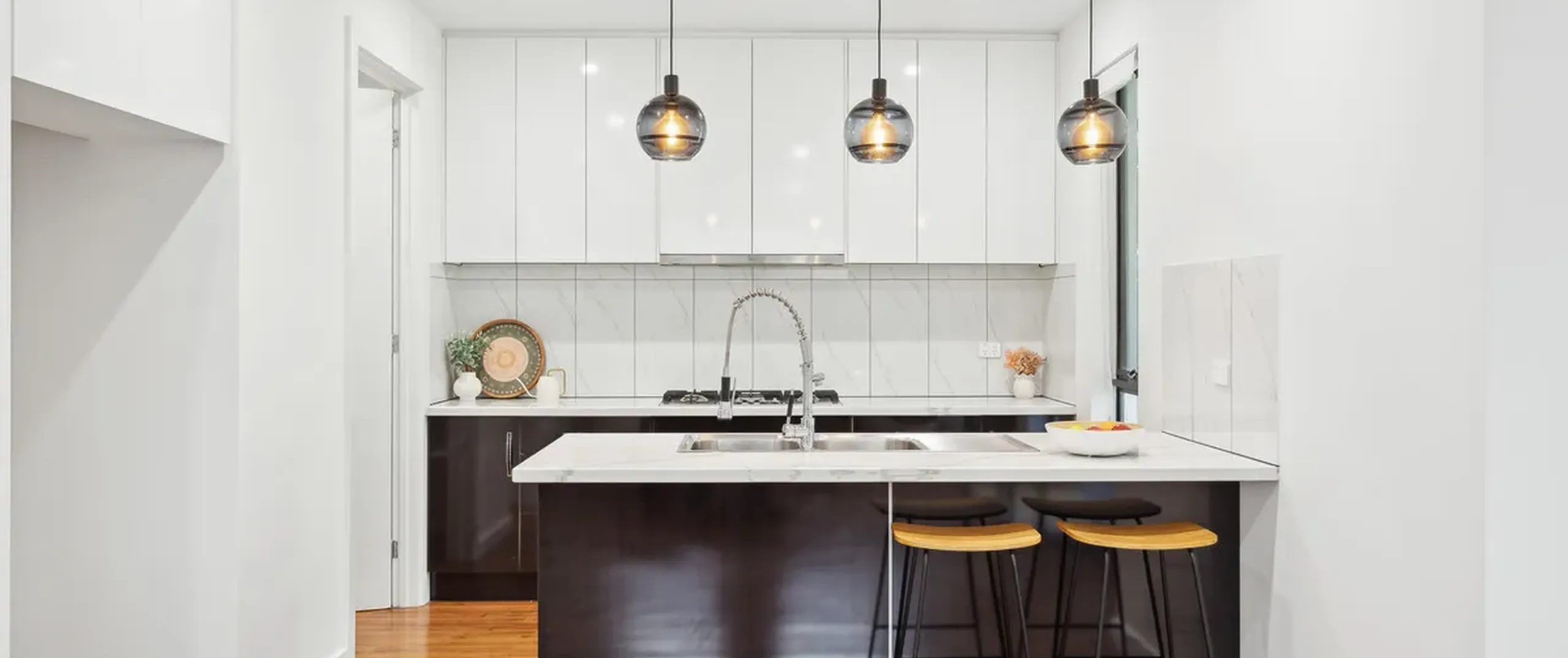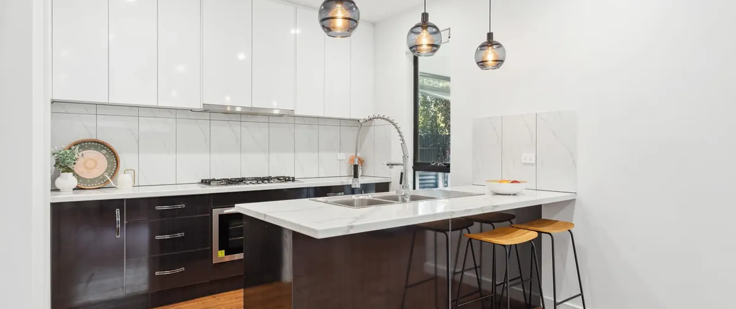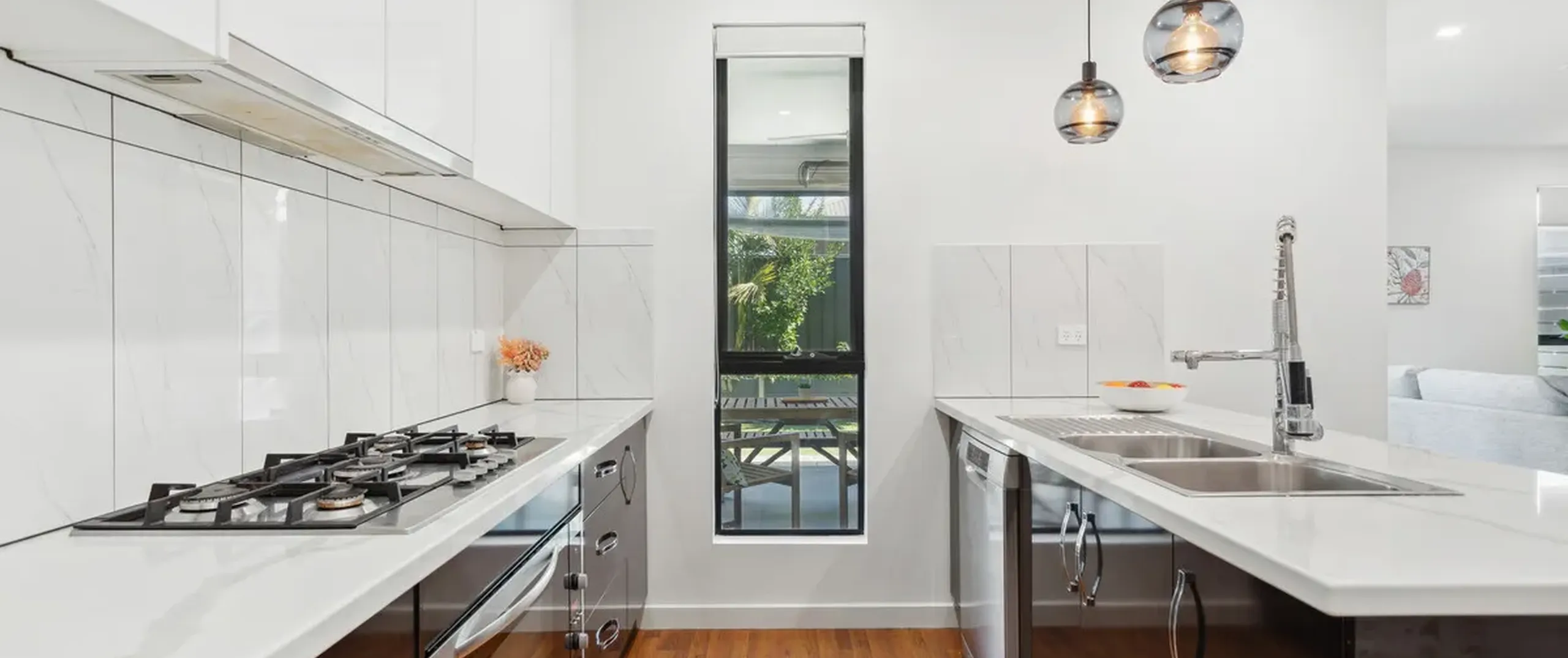 - Sleek designer kitchen with a 900mm gas cooktop, stylish pendant lighting, tiled splashback, walk-in pantry, and dishwasher