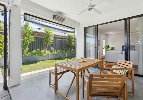 - Tiled alfresco area with blinds, ceiling fan, and heater