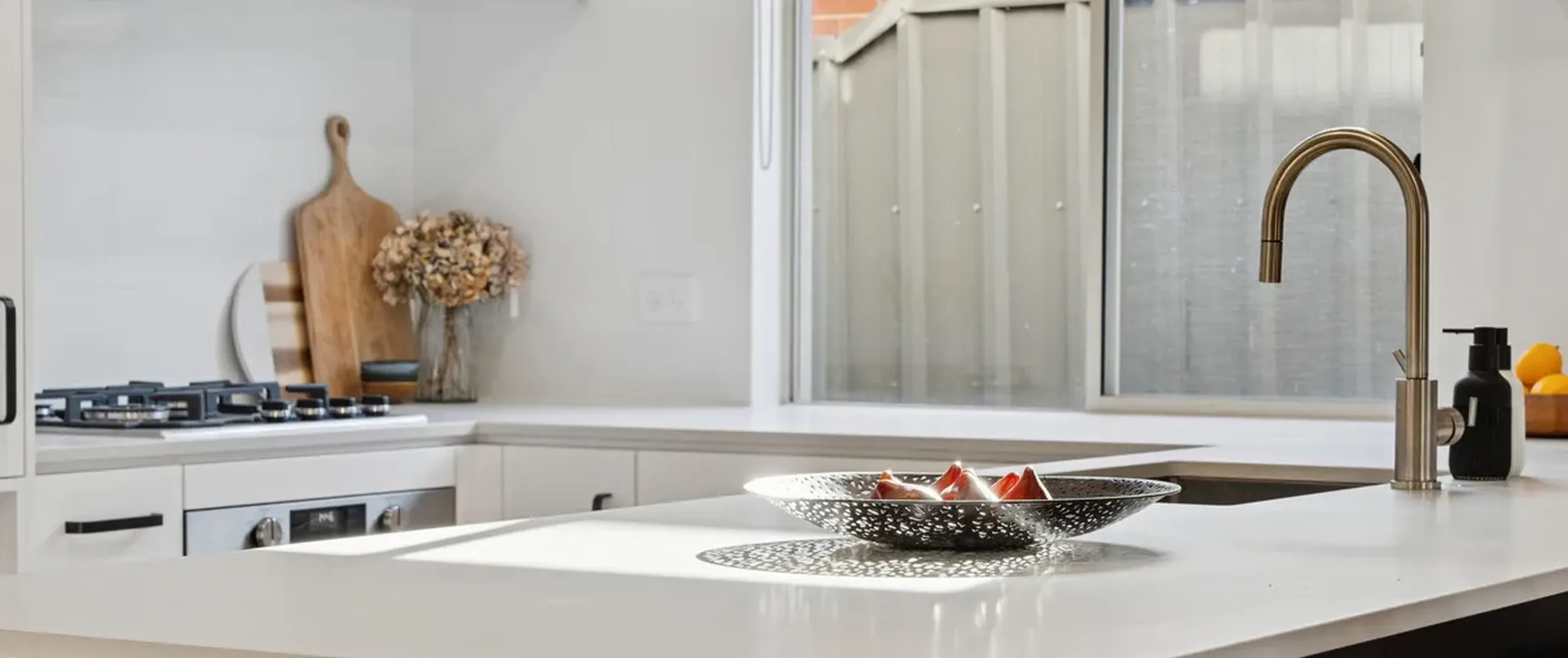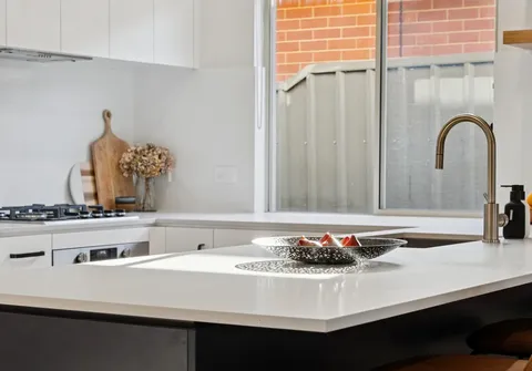 - Designer Farquar kitchen with stainless steel appliances, gas cooktop, stone benchtops with breakfast bar, undermount sink and filter tap