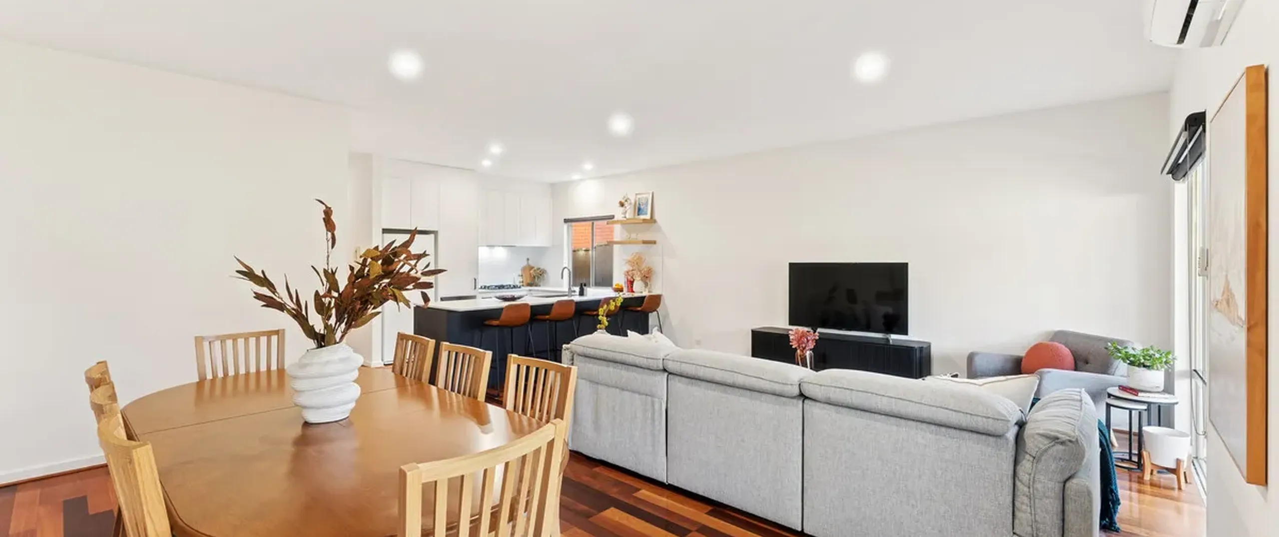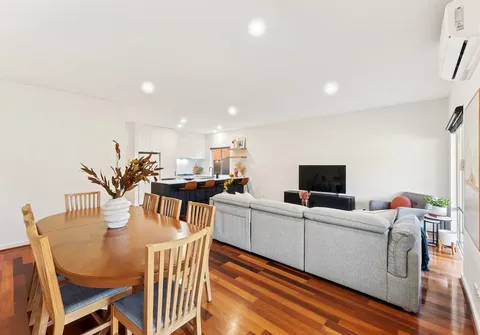 - Open plan living, dining and kitchen area with split system air conditioner and polished floorboards