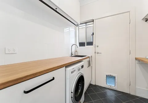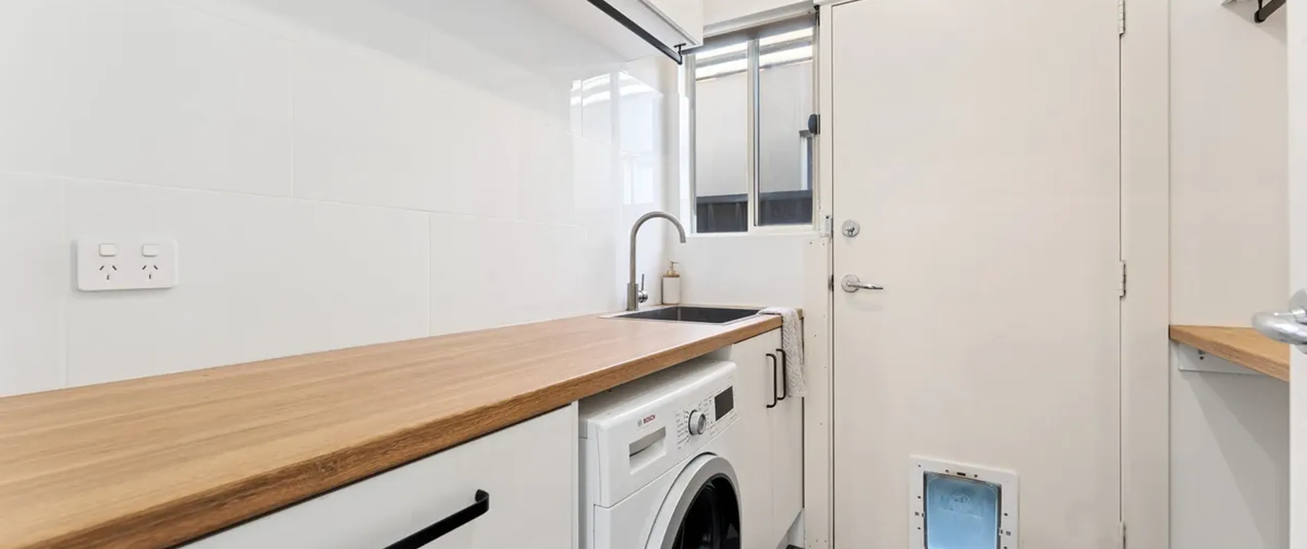 - Renovated laundry with ample bench space, sleek tiled wall, cupboards with clothing rack underneath and direct external access