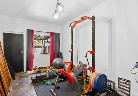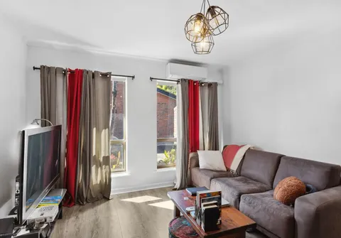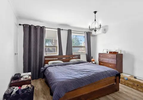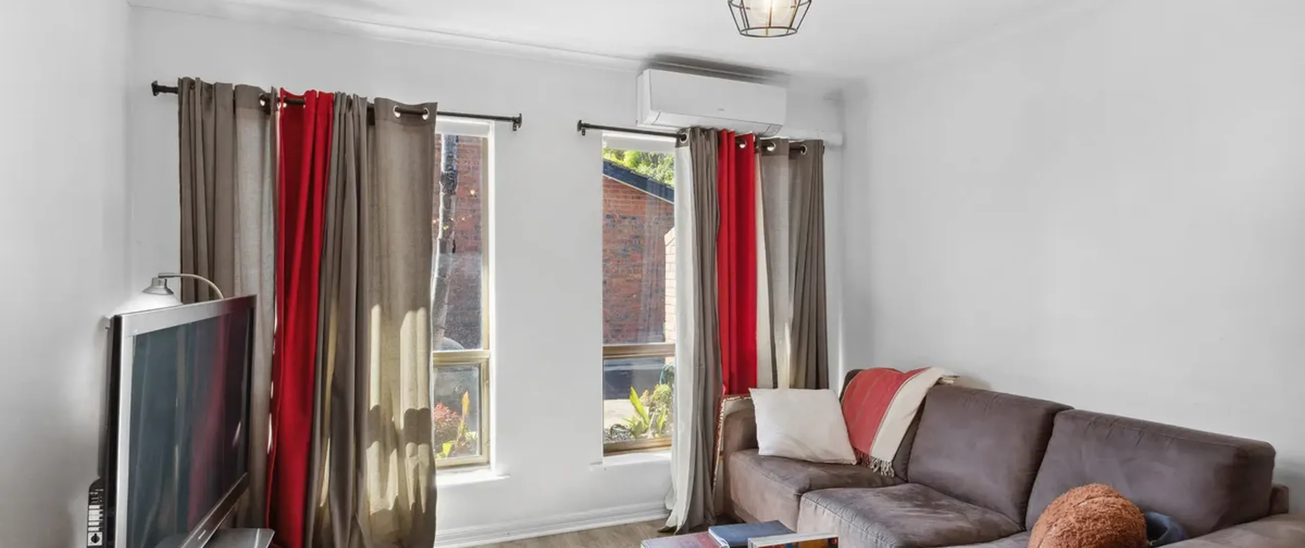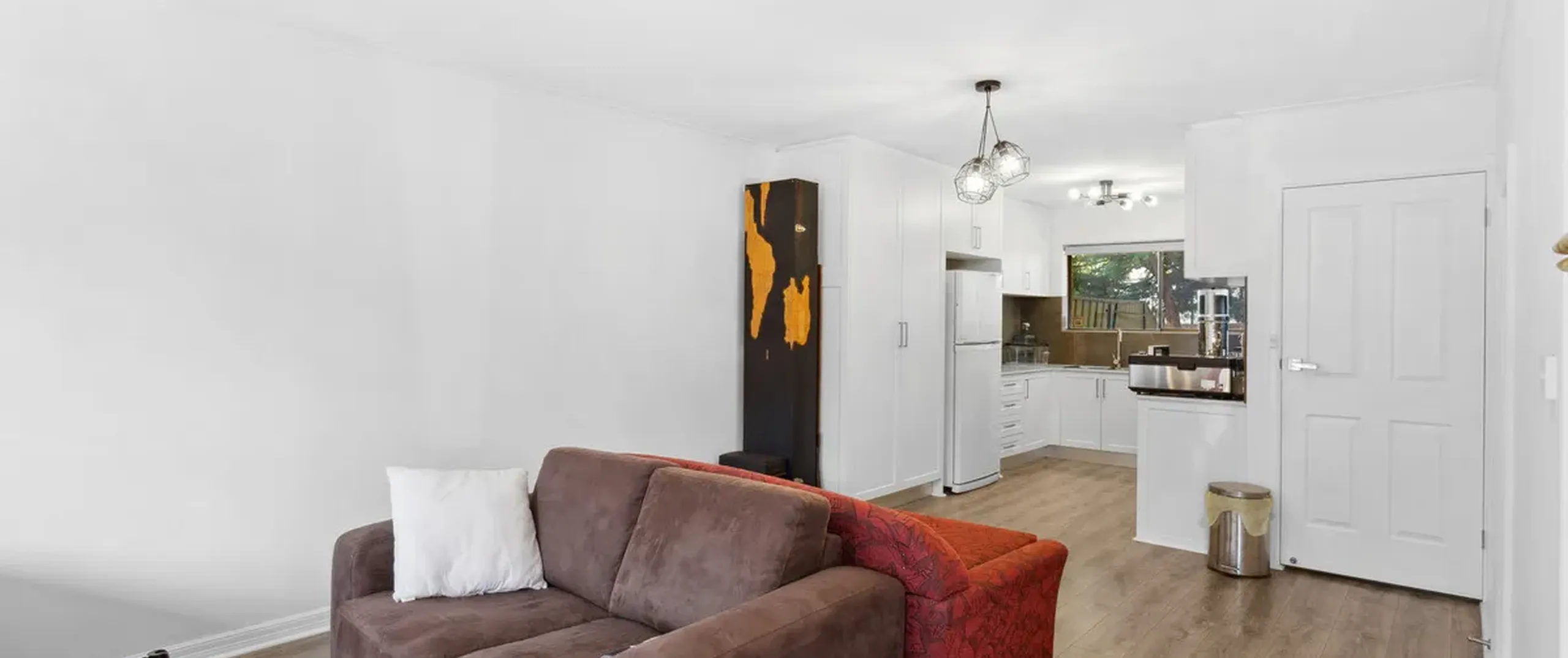 - Open plan kitchen, living and dining room with modern floating floorboards and split system air-conditioner