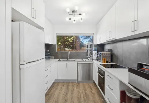 The open-plan living and dining area seamlessly flows into the stunning modern kitchen, which features top-of-the-line amenities including a dishwasher, sweeping stone benchtops, an induction cooktop, and abundant storage. Step outside to a low-maintenance tranquil courtyard with a pergola, providing the perfect setting for daily coffees or outdoor relaxation.