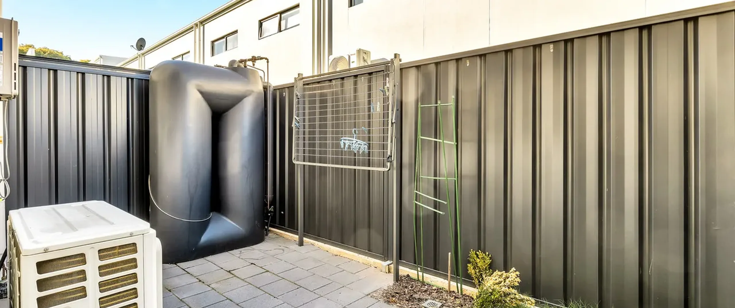 - Low-maintenance paved courtyard with easy-care garden bed, artificial lawn and rainwater tank