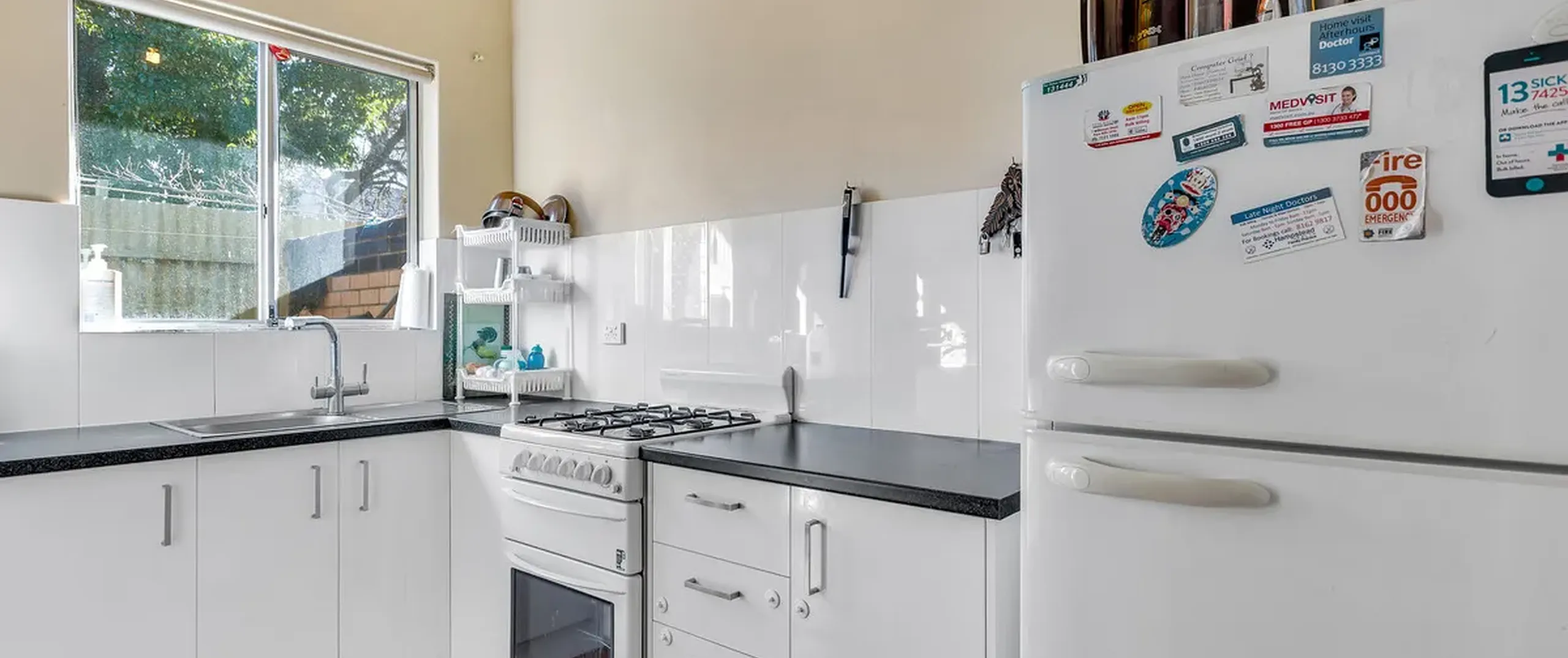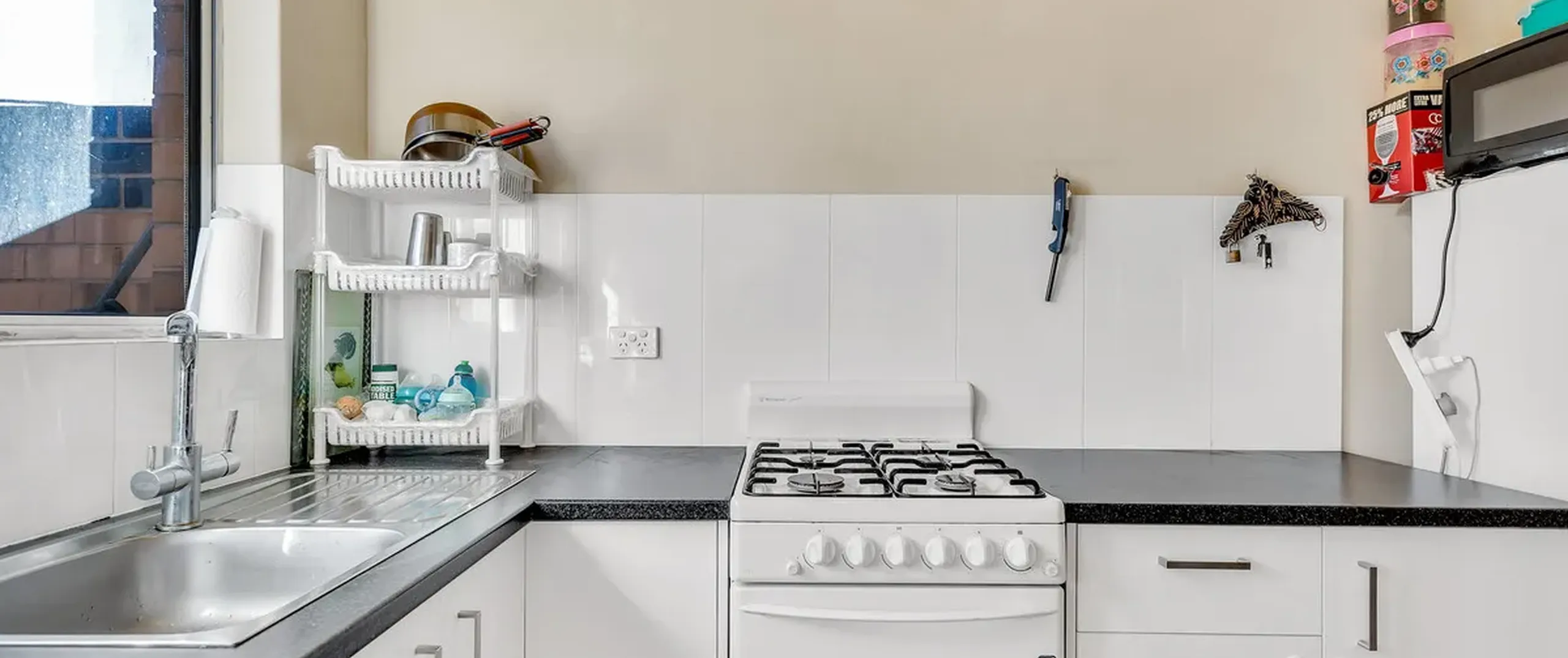 - Updated L-shaped kitchen with tiled splashback and gas cooktop