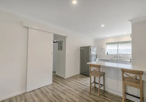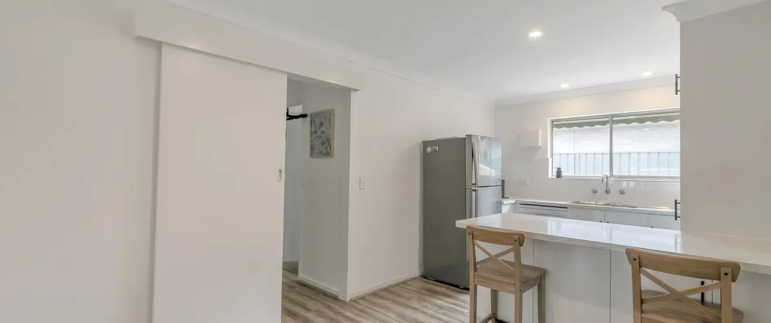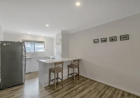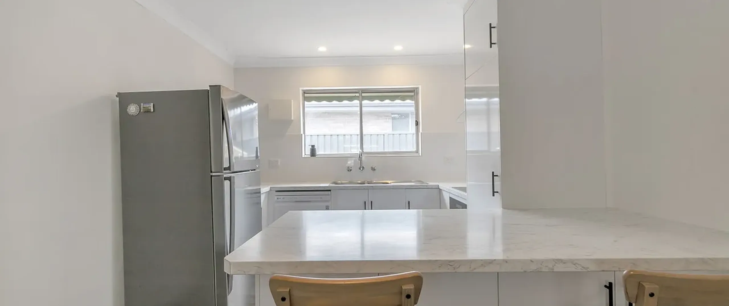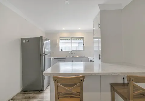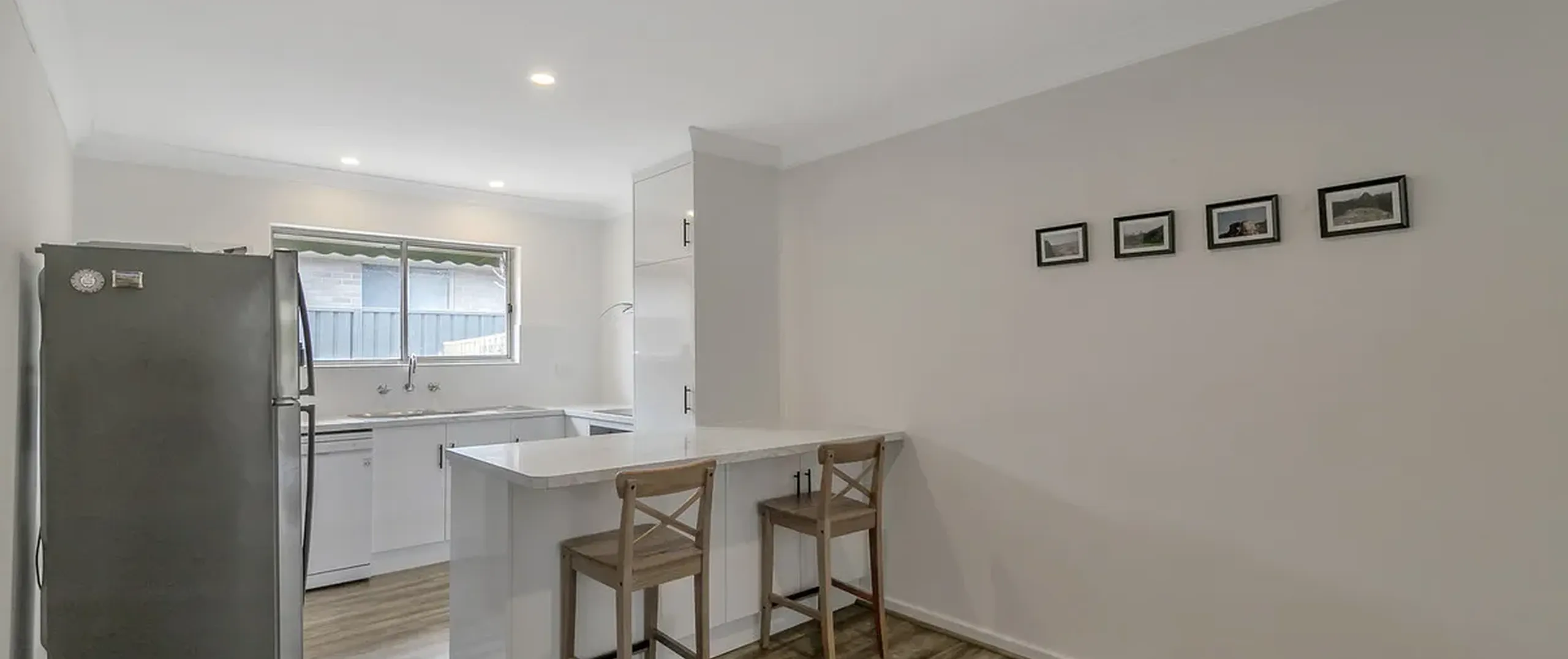 - Modern white kitchen with dishwasher, ample cupboard space and breakfast bar